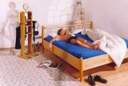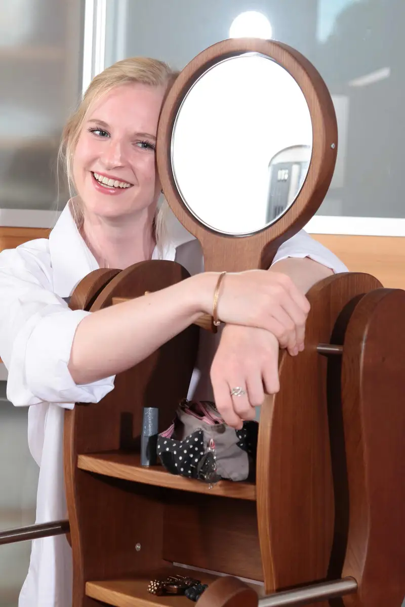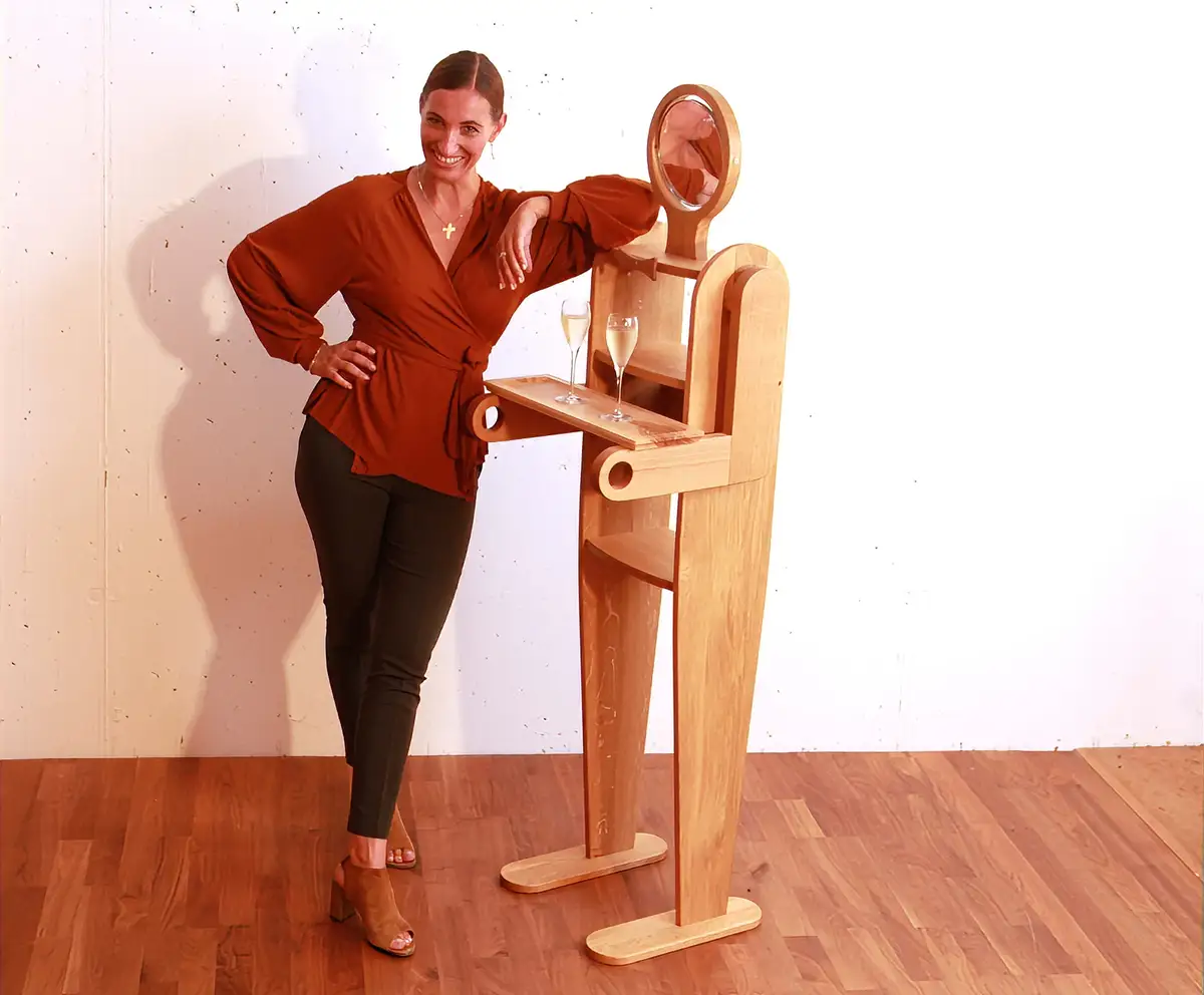 Nein, es geht nicht um Nina (20), die hier so verführerisch lächelt und den Sekt für einige schöne Stunden schon kalt gestellt hat. Nein, es geht um Giovanni, ihren stummen Diener, der ihr so formvollendet Handtäschchen und Strümpfe abnimmt und sogar noch ein Plätzchen für das Sektglas hat. Der hölzerne Helfer kommt nicht, wie der Name vermuten lässt, aus Italien. Er hat seine Wurzeln tief in der Region. Das Material wuchs in den Wäldern rund um Hersbruck, wurde dort zu Brettern gesägt und gehobelt. Die Möbelmacher, die in Unterkrumbach ausgefallene Einrichtungen entwerfen und herstellen, geben den Buchenholz-Stücken den letzten Schliff - und heraus kommt Giovanni, ein echter Franke.