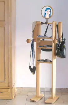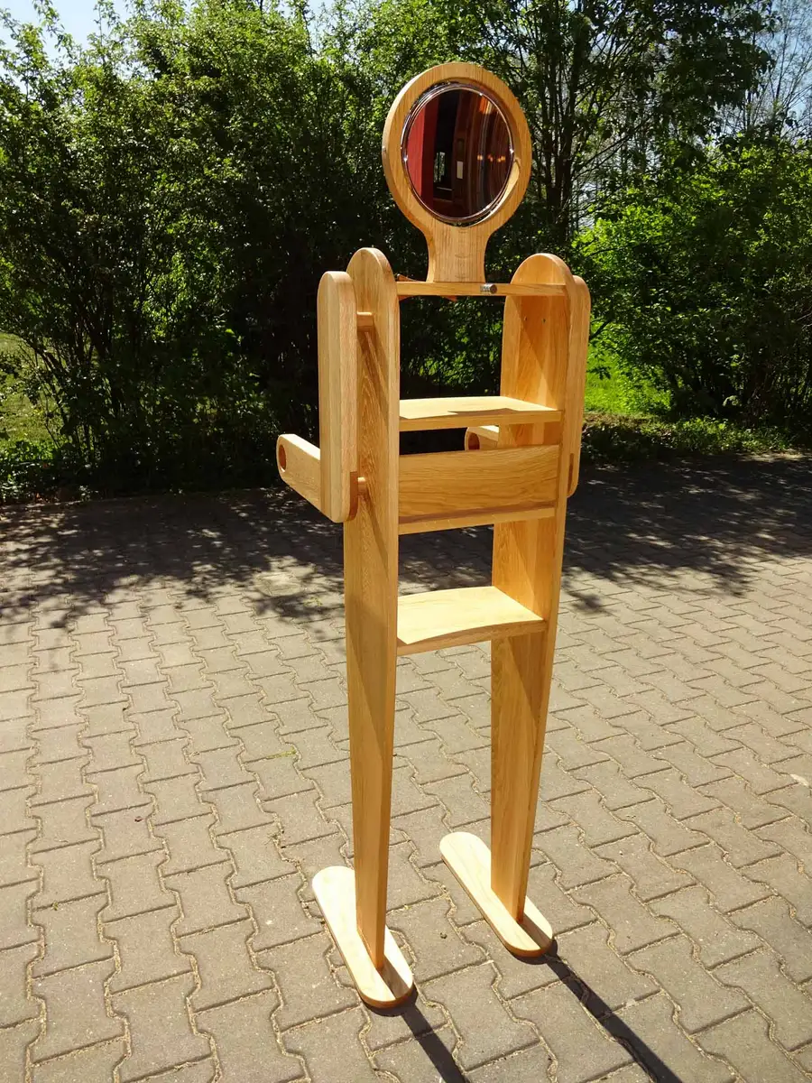Stilvoll dient er seiner Chefin als Ablage für alles, was sonst rumliegen würde. Meist aus Buche, aber auch unsere anderen Holzarten sind mit ausreichender Lieferzeit erhältlich. Alle Teile, die nicht aus Holz oder Glas sind (der Spiegel) sind aus Edelstahl und wir können ihn auch per Post verschicken.