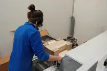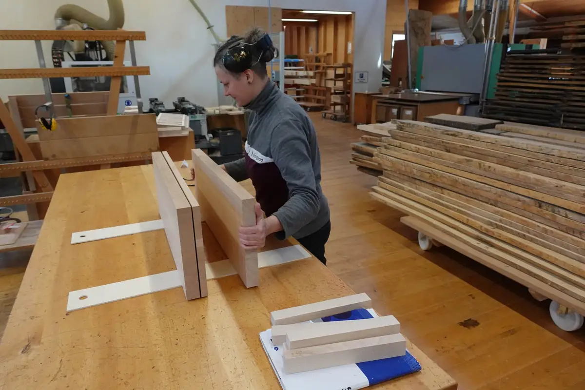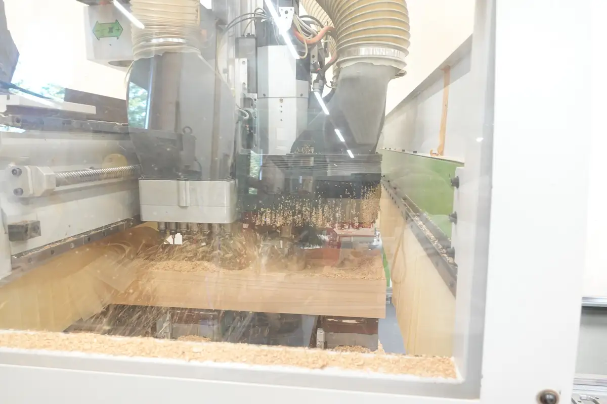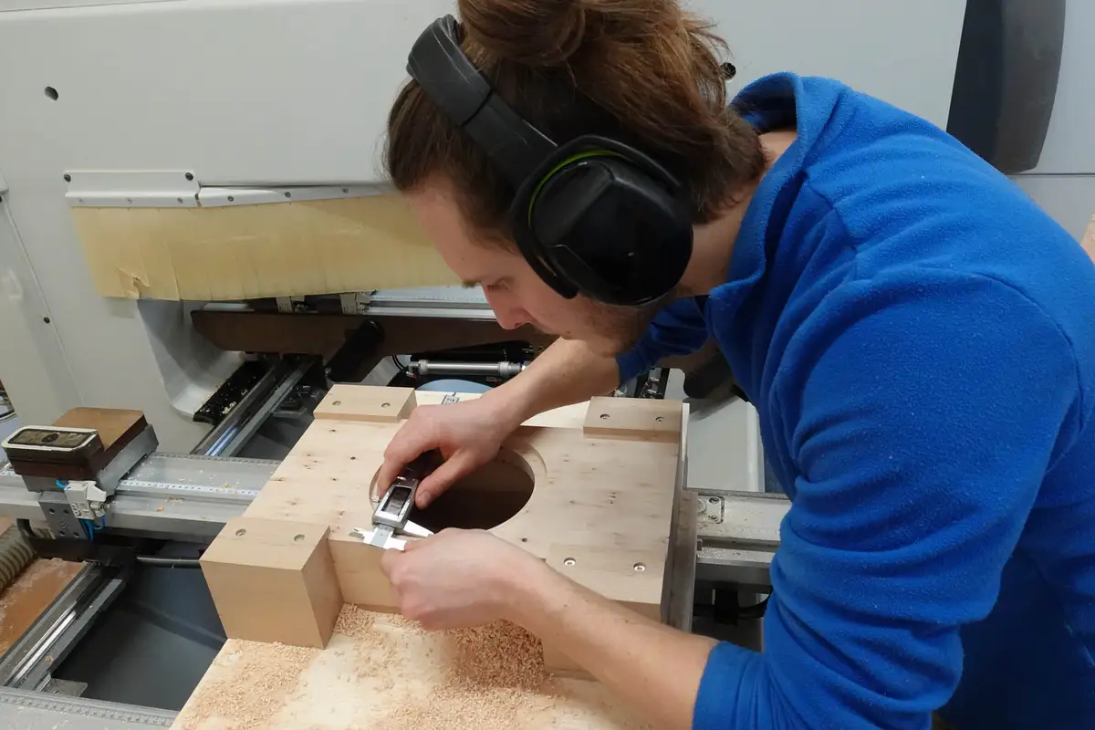 Auf der CNC-Maschine misst Meisterin Sophia für die Massivholz-Lautsprecher nochmal genau nach