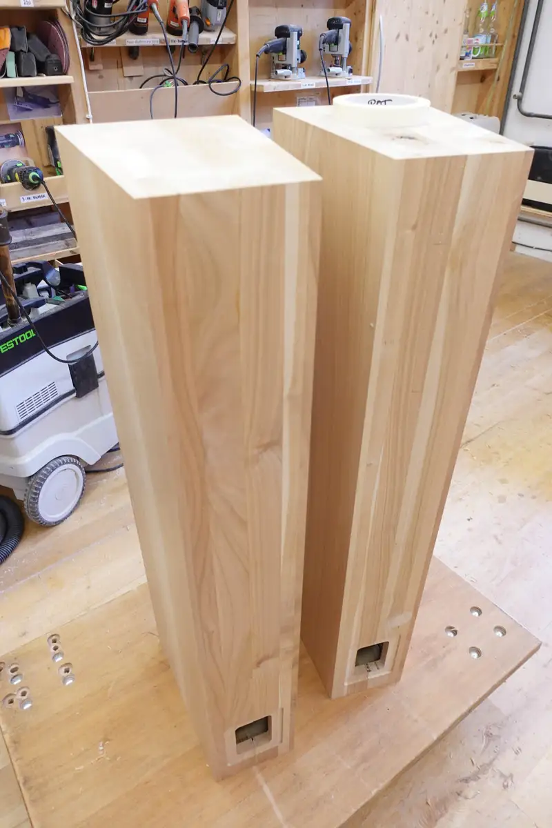 Die aus massivem Kirschbaum verleimten Blöcke werden zu halben Lautsprechern gefräste, die später zu einer ganzen Massivhlzbox verleimt wird
