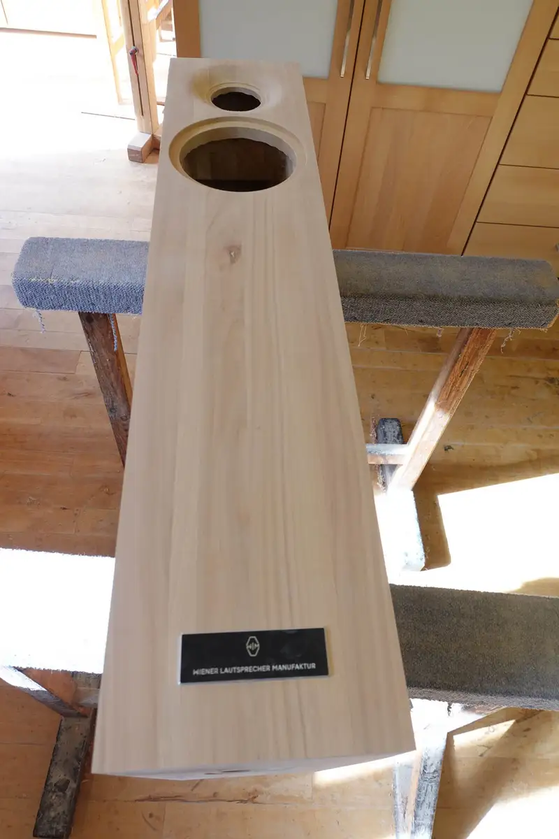 Seriennummer 2 hat unser erstes Lautsprecherboxenpaar aus Massivholz, das wir gemeinsam mit der Wiener Lautsprechermanufaktur entwickelt haben, die Nummer 1 haben unsere Freunde in Innsbruck – der doofe Fotograf, der die Seriennummer mit dem Kabel verdeckt hat, war ich leider selbst ...