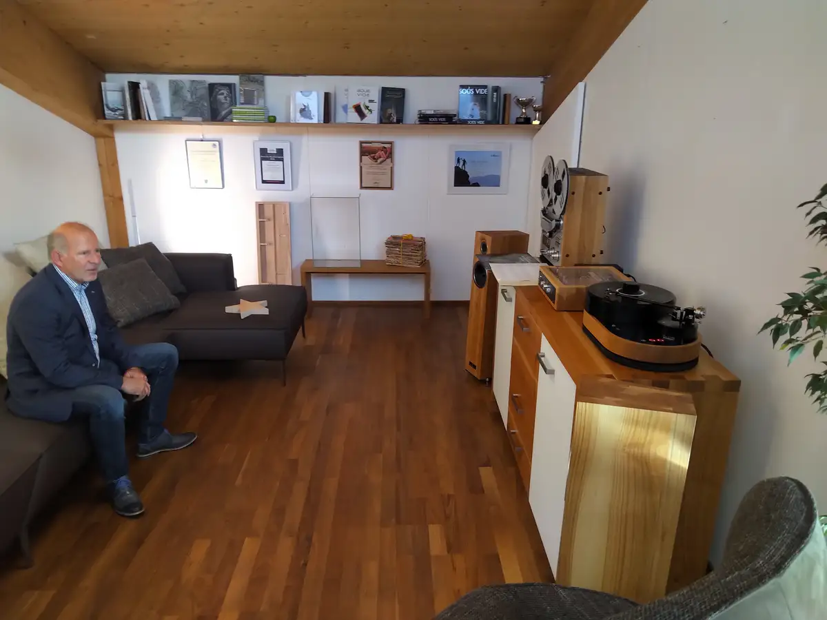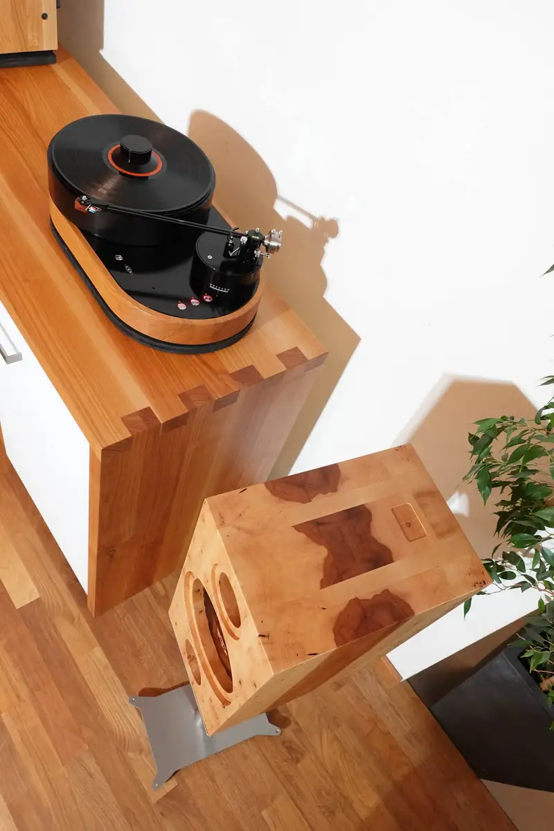 Julian Lorenzi aus Engelthal, glücklicher Besitzer einer Möbelmacher-Elsbeerenküche der Möbelmacher, ist Hersteller von Highend-Plattenspielern seiner Marke AMG (Analog-Manufaktur-Germany). Die Möbelmacher fertigen für diese Einlegerahmen aus Massivholz und besuchten den Kunden im Mai 2022 auf der Highend-Hifi-Messe in München. Beim Rundgang entdeckten sie die Wiener Lautsprechermanufaktur, einen Hersteller von klanggewaltigen Massivholz-Lautsprechern. Auf die Frage nach einer möglichen Zusammenarbeit bat CEO Andreas Steiner sie spontan darum, die benötigten Lautsprecher doch selbst herzustellen und bestellte selbst gleich ein Paar mit.