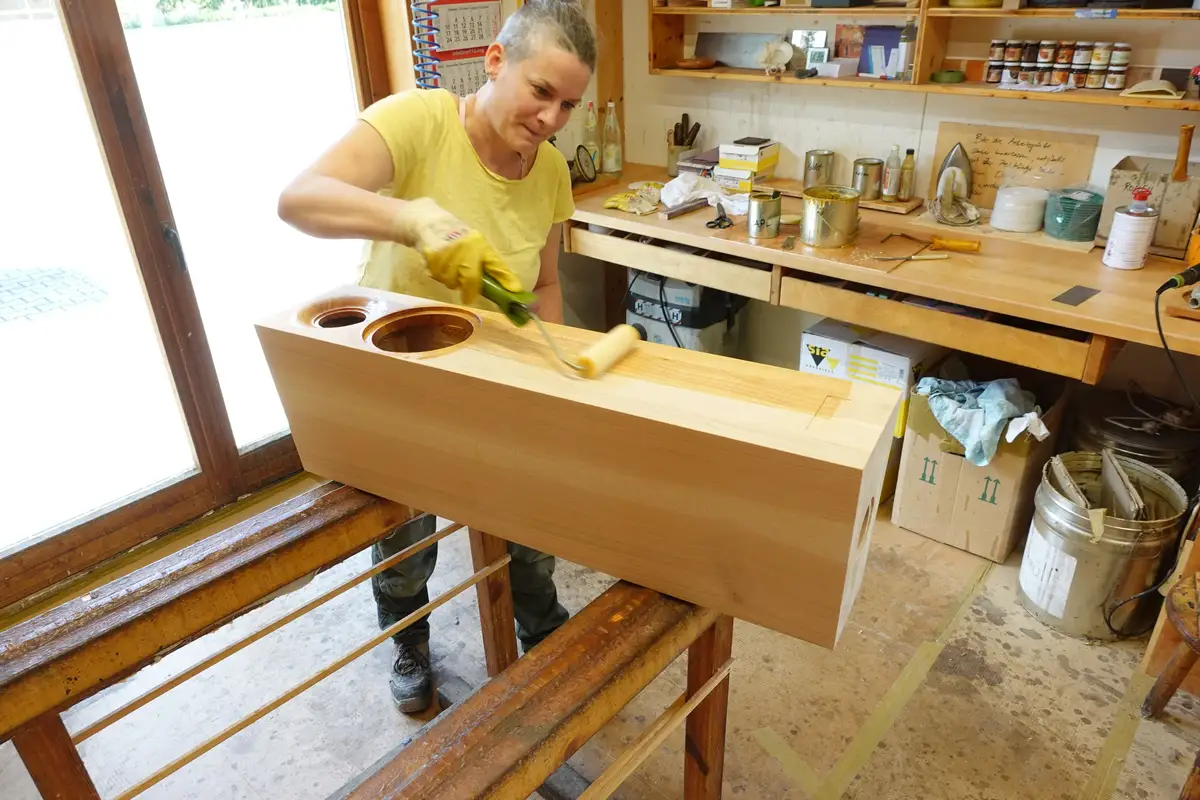 - Für die Oberflächenbehandlung verwenden wir ohne Ausnahme die Naturharzöle der Firma Livos