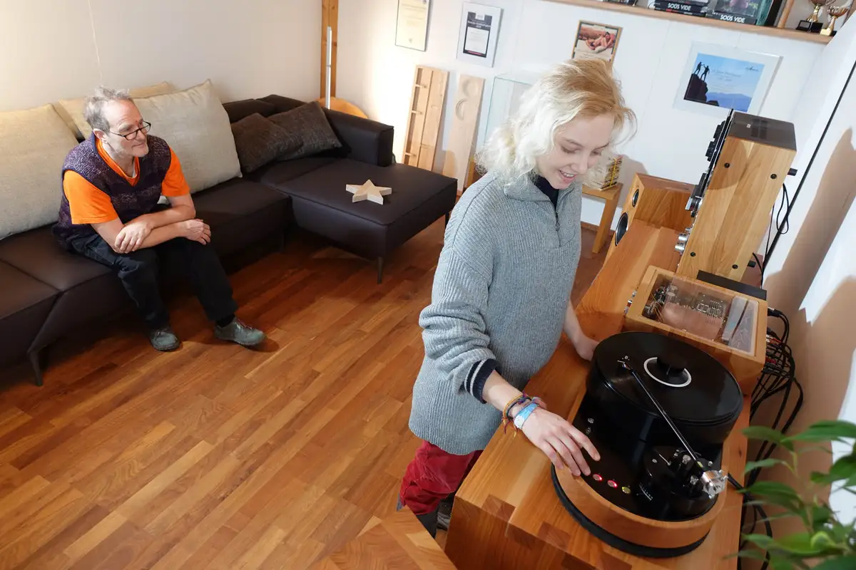 Carola und Julian Lorenzi haben sich für eine Massivholzküche aus Elsbeere entschieden (hier ist sie zu sehen), gleichzeitig verliebte sich herwig Danzer in die Plattenspieler von Julians Firma AMG (Analog-Manufaktur-Germany). Weil sich alle gut verstanden und Danzer schon als 14-jähriger Hififreak eine eigene Tonbandmaschine und Plattenspieler hatte, entstand der Wunsch, die Holzgehäuse für die Plattenspieler nachhaltig aus regionalem Holz in Unterkrumbach zu fertigen.