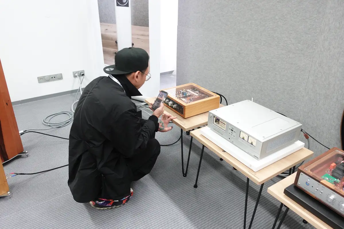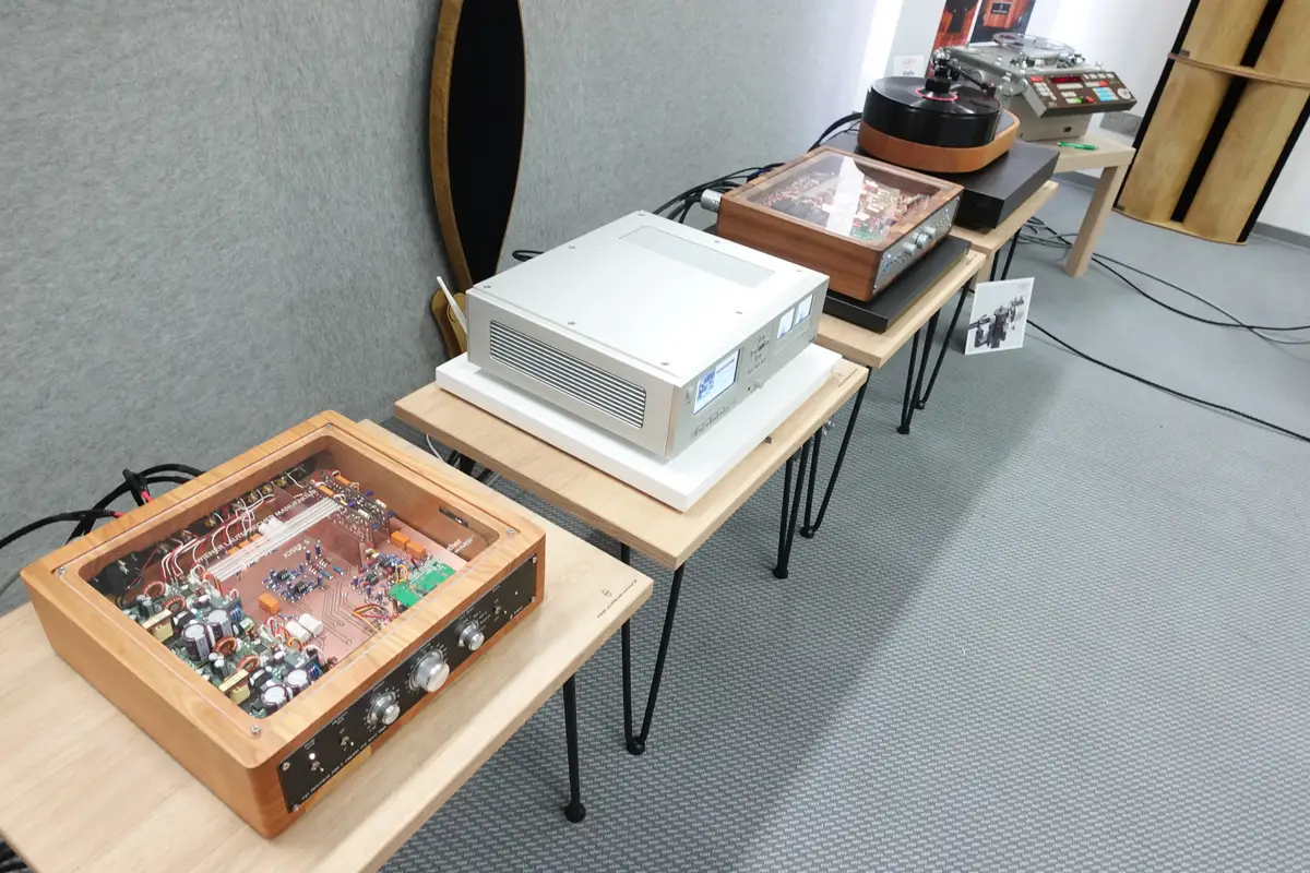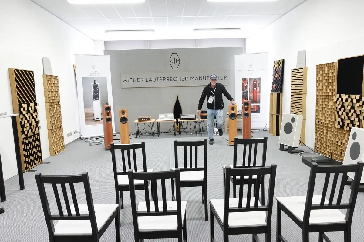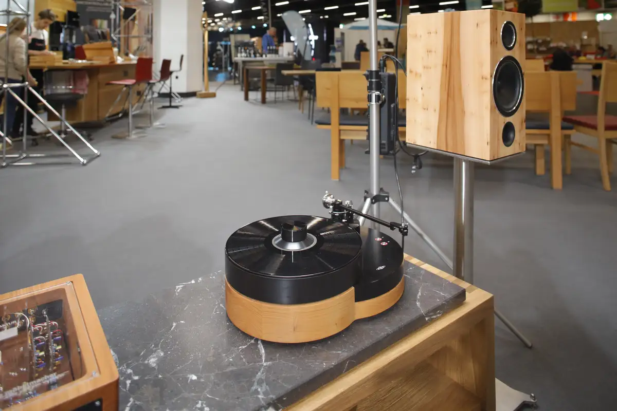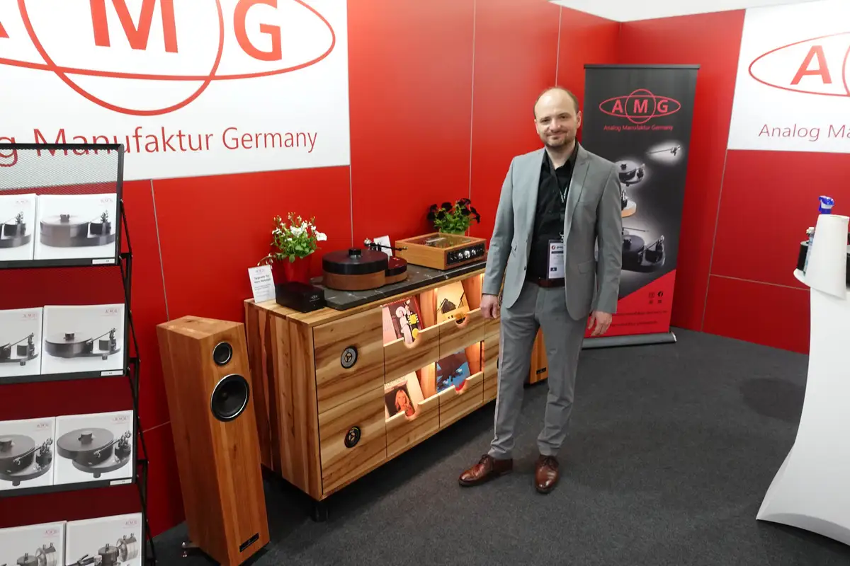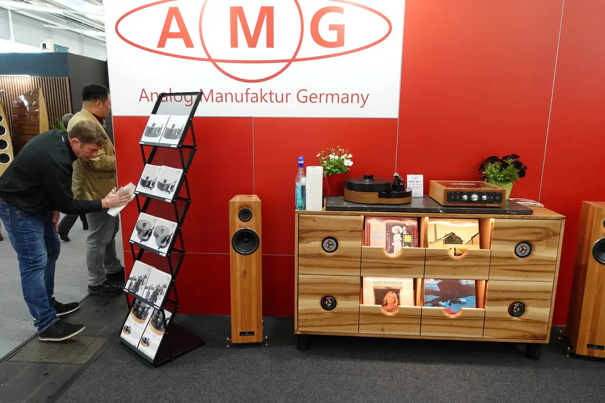 Auf der High End München 2025 am Stand der Analog Manufaktur Germany, ausgestattet mit Möbeln und Holzchassis der Möbelmacher
