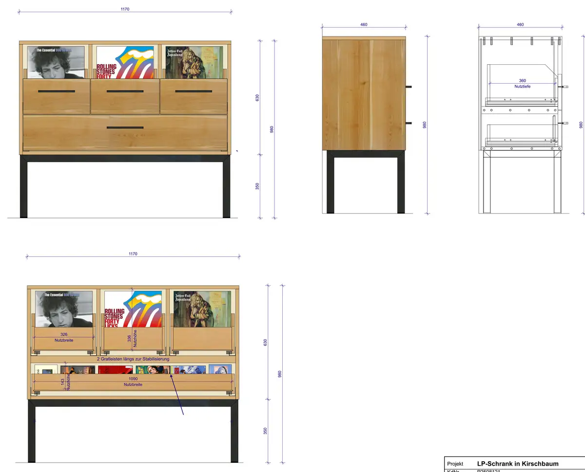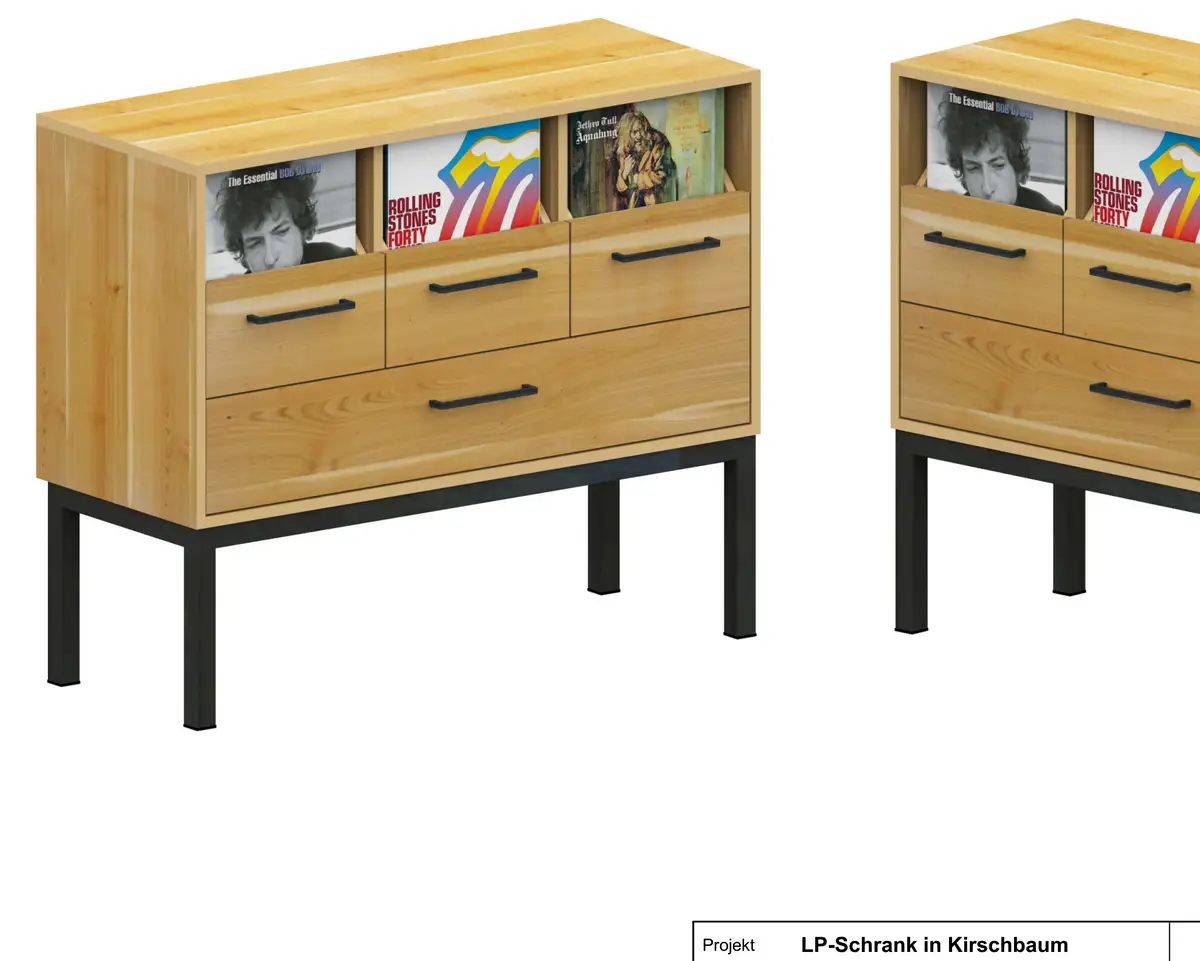So wird der Kirschbaum-Schallplattenschrank bald in Bamberg stehen: 3 Plattenschubladen oben, drei geschlossene unten, Rohstahlgriffe und Füße