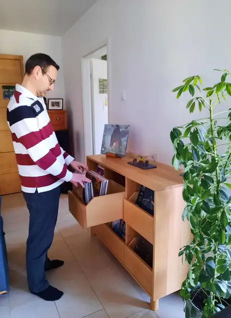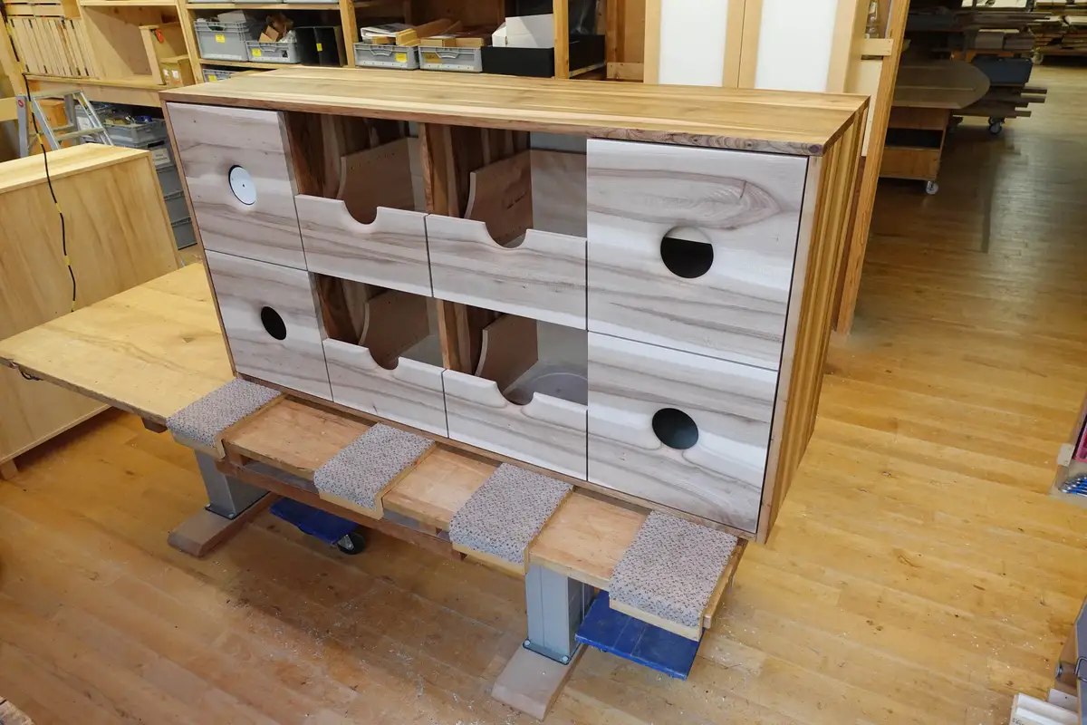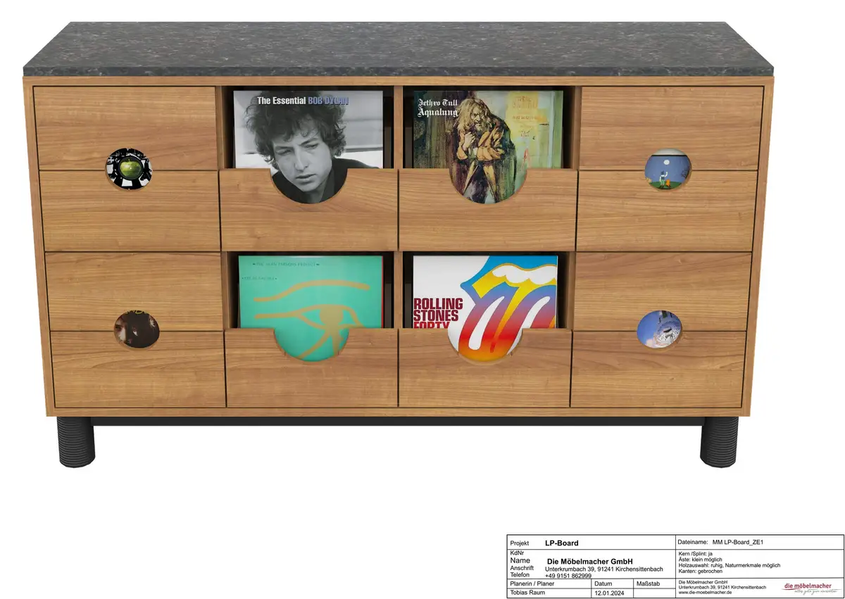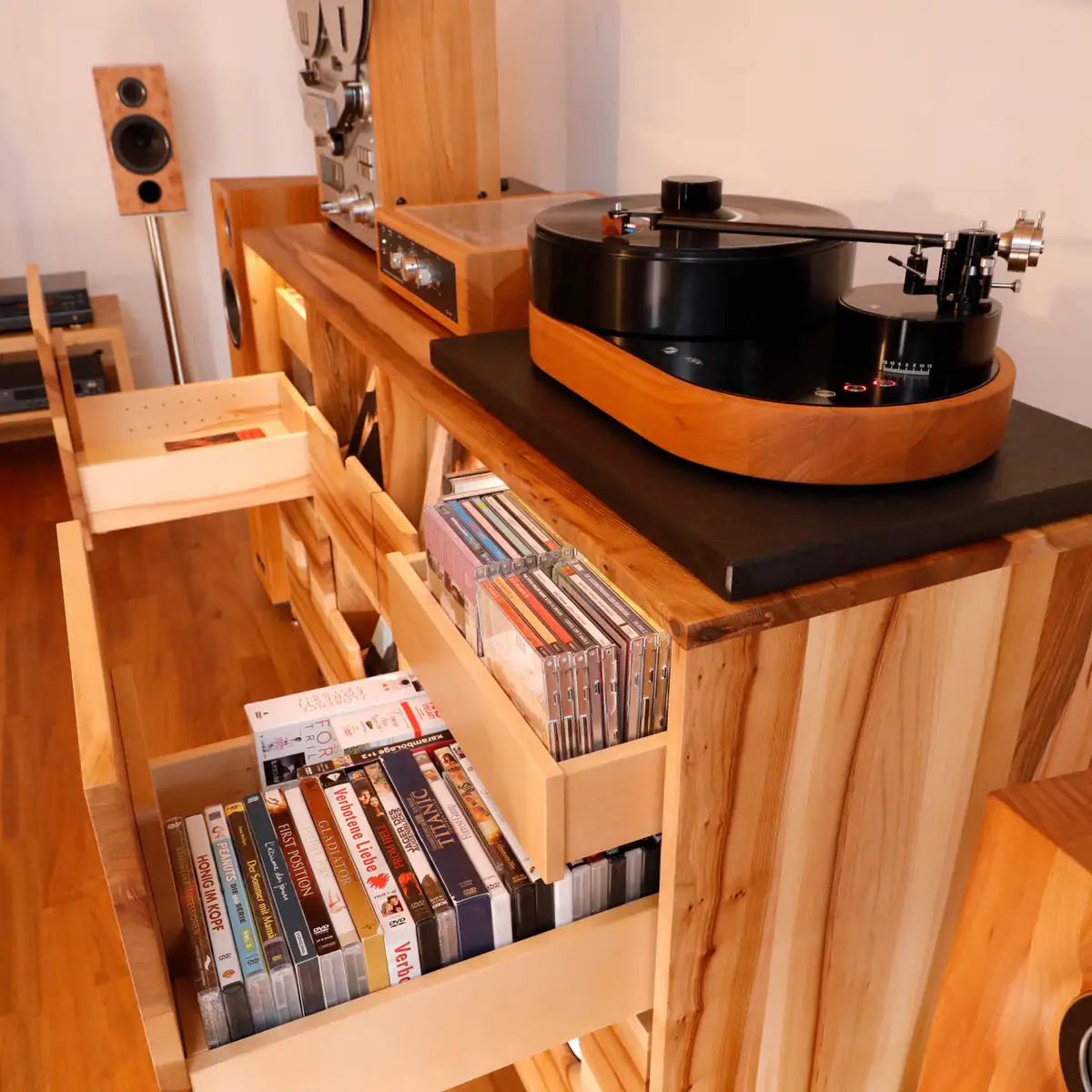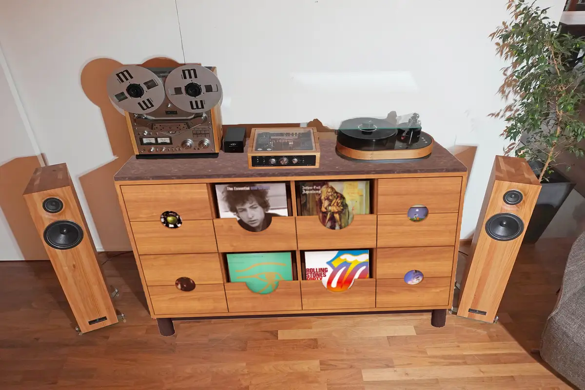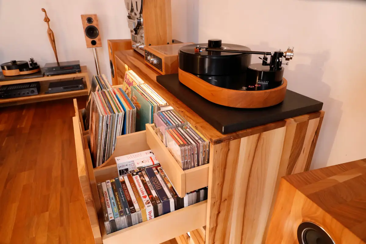 Als ersten Schrank für unseren neuen Plattenspieler nebst Verstärker und Boxen und Tonbandmaschine wählten wir einen Barschrank aus unserer Ausstellung. Dabei lernten, wir, dass es sehr angenehm ist, wenn beim Öffnen der Schublade das Licht angeht und dass das Blättern in den Schallplatten viel inspirierender ist, als das Herausziehen der einzelnen Scheiben aus einem Regal. Also entstand der Entwurf für den neuen Hifischrank mit vielen Schubladen für Schallplatten, aber auch Platz für CDs, DVDs und die großen Bänder der Tonbandmaschinen. Die Schallplatten wollten wir zeigen, weshalb die Schubladen nur halbhoch sind und die gerundete Fräsung der Lautsprecherboxen der Hörner für die Hochtöner aufnehmen.
