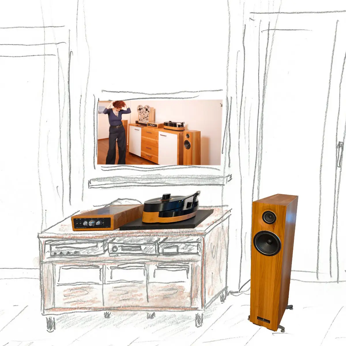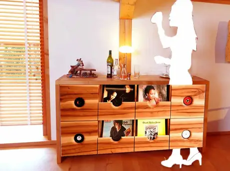 Ein Kunde hatte die Idee, das Kirschbaumsideboard mit dem Schallplattenschrank zu kombinieren, also haben wir es mittels Photoshop und dem schon vor Jahren fotografierten Bild des Schranks mit der mixenden Nachbarin Lene aus Kleedorf visualisiert.