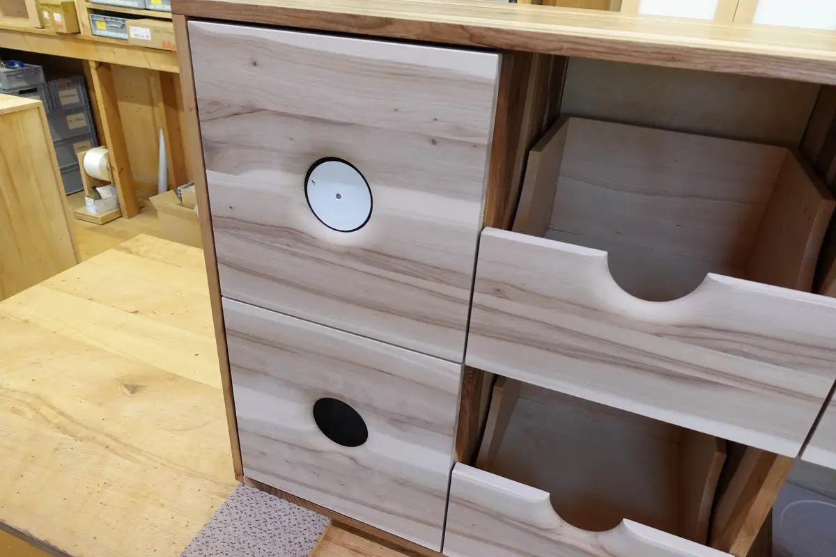Die Maserung läuft über die gesamte Holzfront durch, weil sie zunächst in einem Stück verleimt wurde und erst danach in die Fronten aufgetrennt wurde. Etwas ganz besonderes entsteht, wenn die Kernstruktur der Maserung durch die Fräsung der Kreise tangiert wird, dann ergeben sich wunderbare Naturschauspiele.
