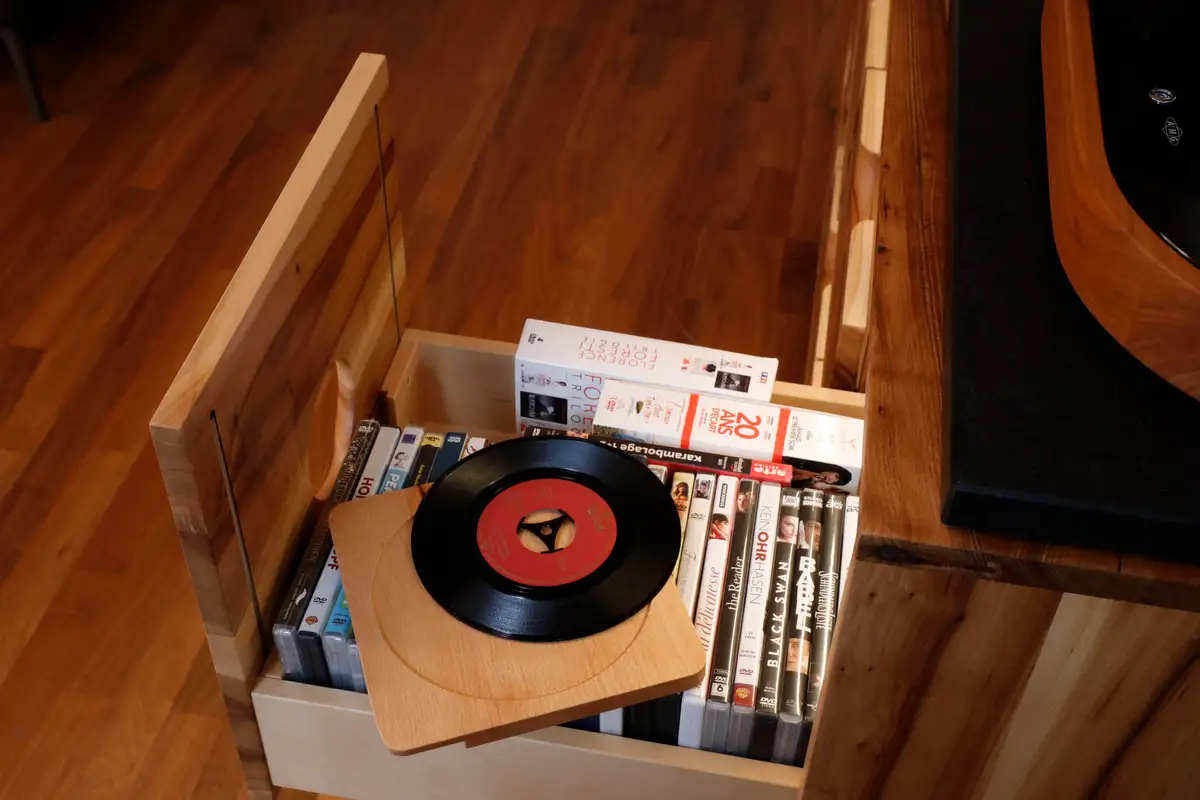 Wir fanden die Idee, Singles hinter die runden Ausfräsungen der Schubladen (die gleichen wie bei den Boxen) zu dekorieren, zumindest originell. Die Singles lassen sich einfach mithilfe eines Holzträgers einschieben, man kann aber auch Fotos, Logos, Leder, Glas, Kräuter oder alles Mögliche dahinterpacken. Es ist ein Prinzip, wie beim Bilderrahmen und das lässt sich natürlich in jedem Schrank, selbst, wenn er nicht für einen Plattenspieler konzipiert sein sollte, verwirklichen.