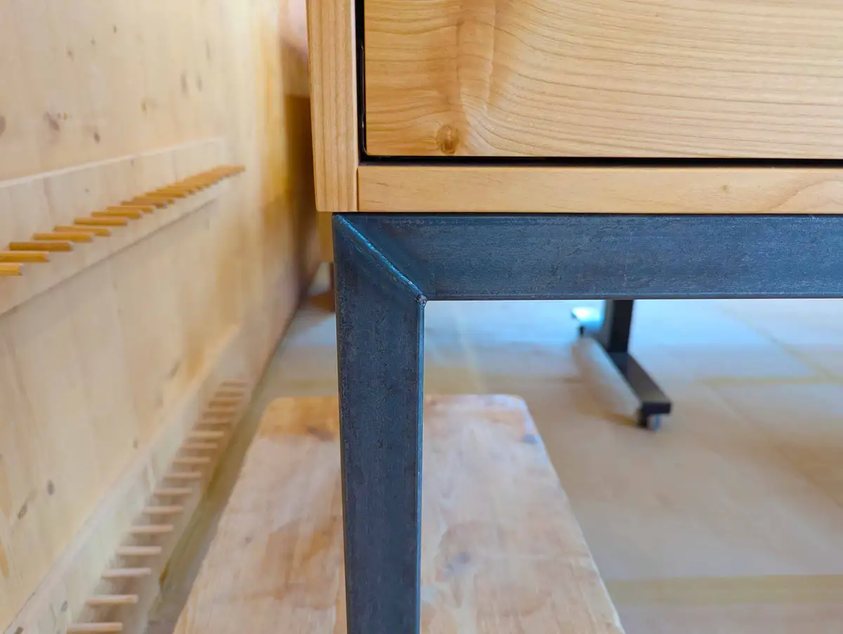 Das Fußgestell aus Rohstahl passend zu den Griffen, alles in Einzelanfertigung