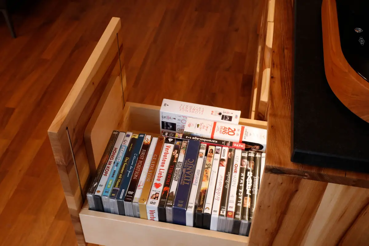 In der untereren Schublade ist noch ganz viel Platz für CDs und DVDs, sowas gabs ja auch mal ...