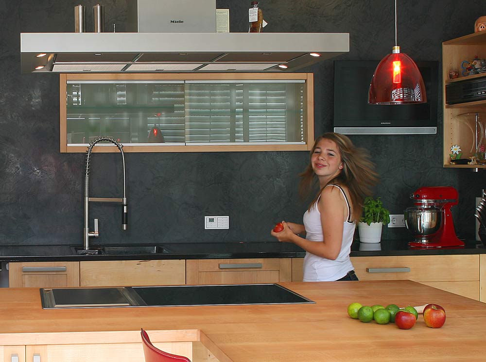 Aber wer mal angefangen hat die Möbel beim gemeinsamen Kochen in der Ausstellungsetage in Unterkrumbach zu entwerfen, wird in Möbelhäusern unglücklich: „Die Verkäufer waren mit unseren Ideen völlig überfordert“ lacht Alessandra und freut sich, dass sie durch ein paar kleine Kompromisse doch noch das ganze Haus „aus einem Guss“ einrichten konnten. Denn zur Küche kamen dann noch Esszimmer, Wohnzimmer, Schlafzimmer, Ankleide, Bäder, Parkett und Garderobe hinzu.