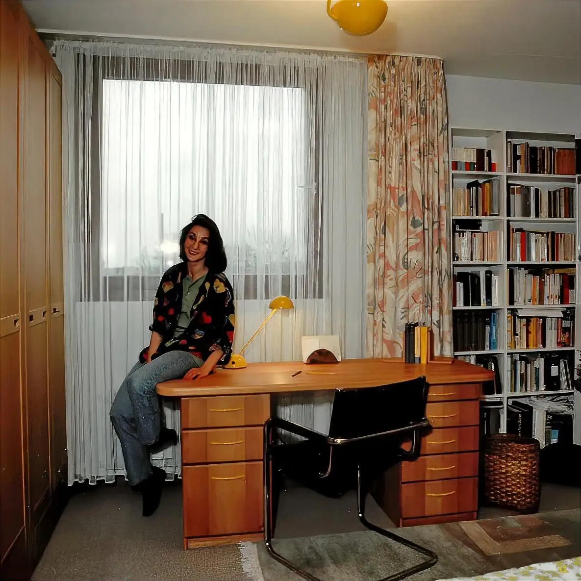 Das Holzregal hinter Katja ist für die Keramik bestimmt und 30 Jahre später drehten wir die Ebenen einfach um, um es an die neue Heimat anzupassen (Siehe oben)
