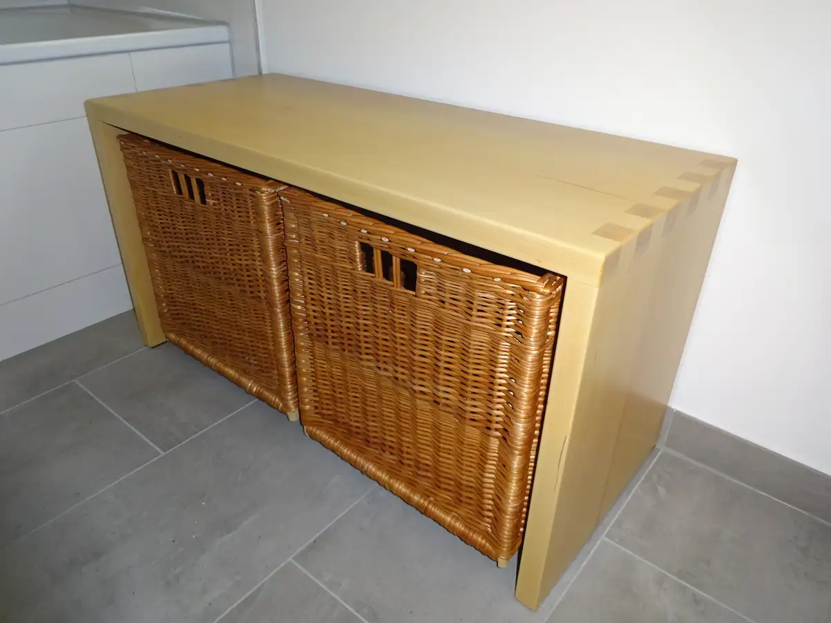 Flechtkörbe für die Wäsche unter dem gezinkten U-Hocker
