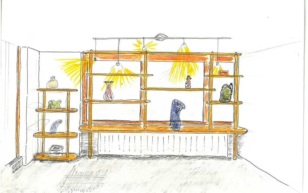 In dem Entwurf für das Glasregal haben wir auch ein Bierfläschchen in die Glassammlung gezeichnet. Erst von Freunden der Familie erfuhren wir viele Jahre später, dass darüber alle furchtbar lachen mussten. Es handelt sich bei den Glaskunstwerken nämlich um wertvolle (!!!), was wir mangels Kompetenz nicht erkannten.