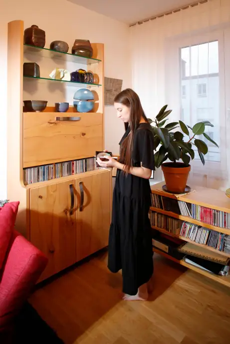Denn das Regal wird mit durchbohrten Holzsäulen durch eine durchgehende Gewindestange aus Metall verbunden, Fachböden aus Massivholz kann man einfach umdrehen und damit die lange Seite zur kurzen machen. Das neue Möbel hat eine Sekretärklappe, die wir sowieso für das genialste Element in einem Regal halten: denn es verschwendet keinen Platz, ist dafür aber unendlich hilfreich beim Aufschlagen von Büchern oder CDs. Junge Menschen wie Natascha erledigen dasselbe dagegen auch mal gerne am Fußboden.