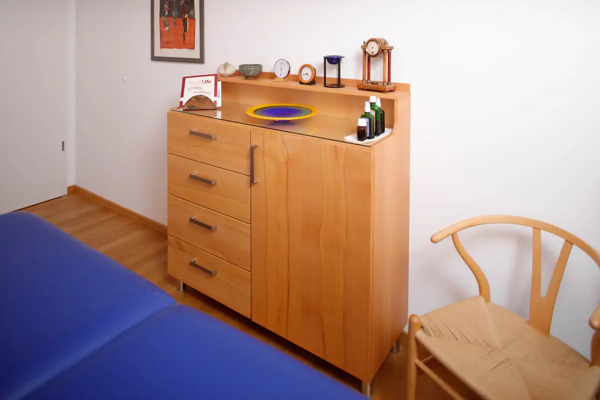 In der neuen Wohnung wurde ein Raum ganz der Massage ihrer Stammkunden gewidmet. Weil dabei sehr viel mit Öl gearbeitet wird, haben wir die Massivholzschränke auf der Oberseite mit Glasplatten abgedeckt, was sich bewährt hat.