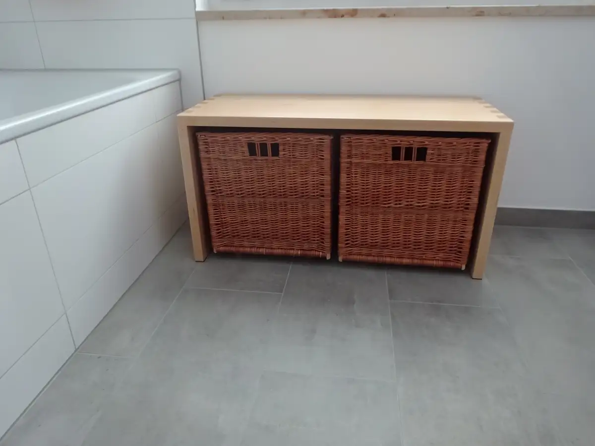 Auch in einem bereits komplett eingerichteten Bad können ein paar Kleinigkeiten große Freude machen. Die niedrige Kommode mit einem Korpus, der mit Fingerzinken verbunden ist, die Wäschekörbe unter einem ebenfalls gezinkten U aus Massivholz nebst passenden Flechtkörben. Die kleine Ablage neben dem Waschbecken und über dem Handtuchhalter erleichtert die anstehenden Aufgaben im Bad ungemein.