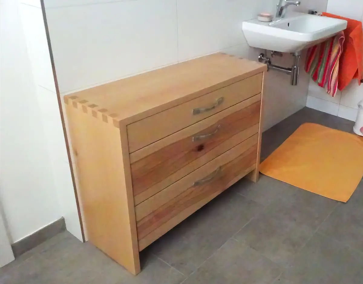 Die Eckverbindung mit Fingerzinken ist der Blickfang dieses kleinen Badmöbels aus rotkerniger Buche