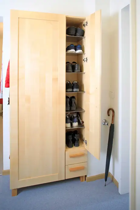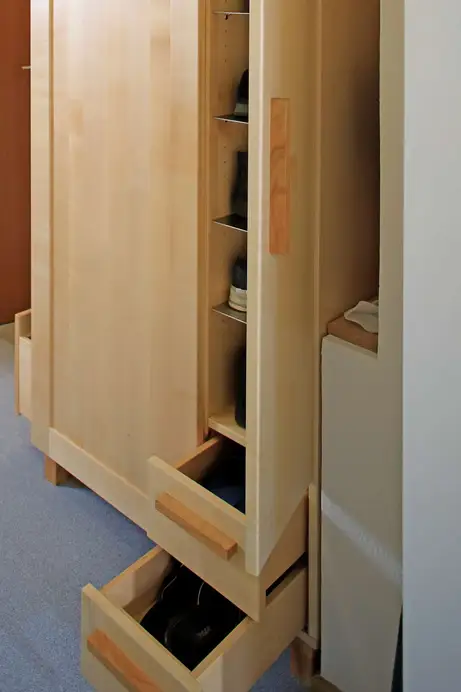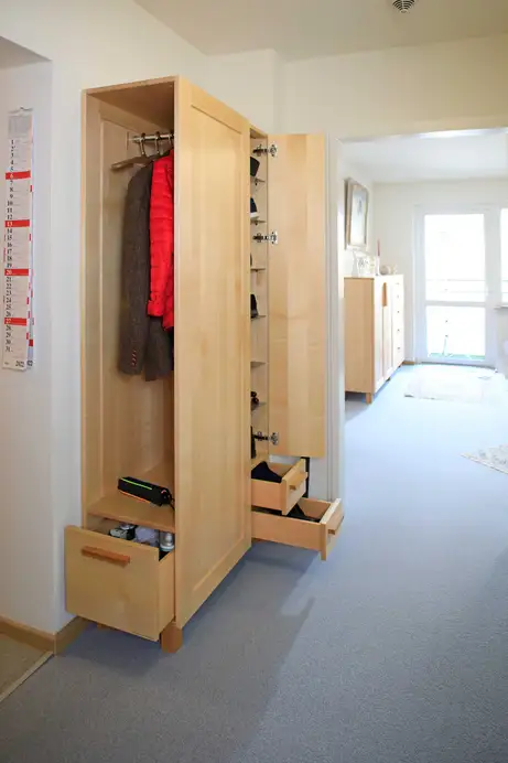 Das ist eine eher ungewöhnliche Schrankkonstruktion mit seitlicher Öffnung für das Hängen der Jacken und Mäntel mit großer Schublade darunter und frontaler Türöffnung für den Schuhschrank mit Edelstahlböden und Schubladen. Aus Ahorn und Kirschbaum, wie in der ganzen Einrichtung des betreuten Wohnens am Tiergarten.
