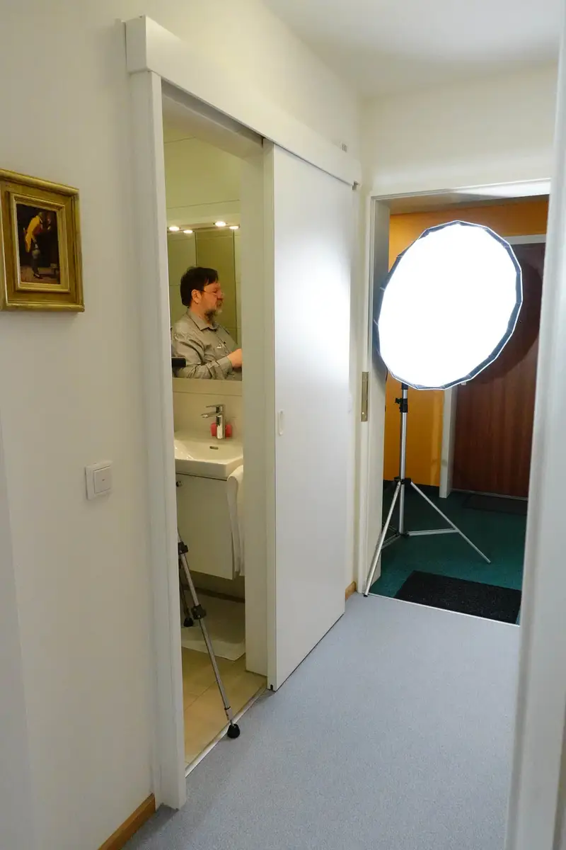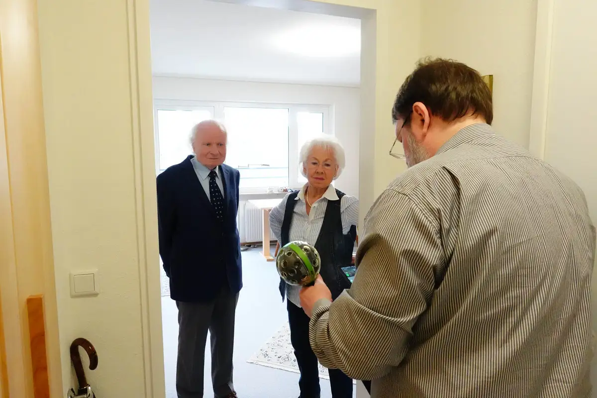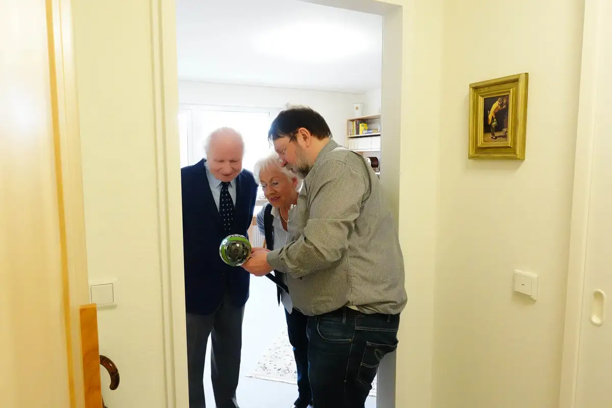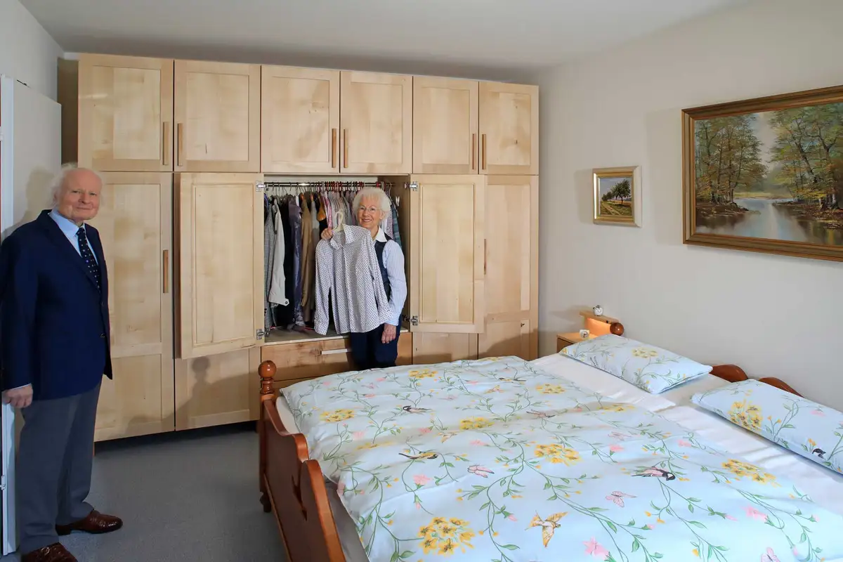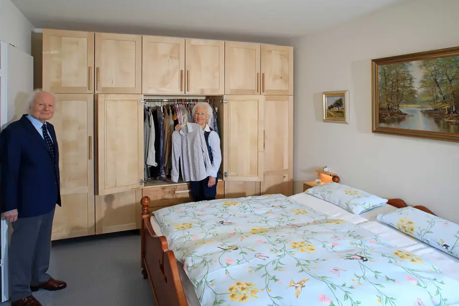 Beim Fototermin im Wohnstift war Herr Conrad noch nichtmal 85 Jahre alt, das wurde er erst eine Woche später. Mit seiner ebenfalls junggebliebenen Frau genießen die beiden das komplett von uns eingerichtete Appartment und freuen sich über jedes winzige Detail ihrer Möbel. Denn die haben wir in langer Gestaltungsarbeit gemeinsam entworfen. Er hatte einige ausgeklügelte Ideen, aber auch ein paar, die seine Frau nicht so doll fand. Deswegen war es wie immer unsere Aufgabe Lösungen zu finden, mit denen beide leben können, die aber vor allem auch funktional sind. Dank des betreuten Wohnens ist die schon fest eingebaute Küche nicht soooo wichtig wie sonst, deswegen konzentrierten wir uns auf