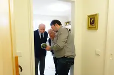 (Er) "Das einzige was war, in der Hitze oder in dem warmen Zimmer muss das Holz noch ein bisschen geschwunden sein, und dann haben die gewackelt, aber die schraub´ ich selber fest. Die schraub´ ich selber fest."(herwig) "Da schau ich noch kurz rein (Scharniere einstellen). Jetzt passts!