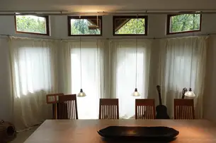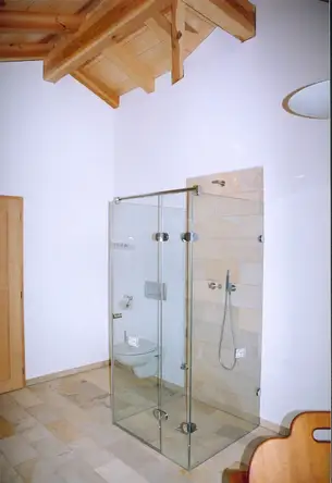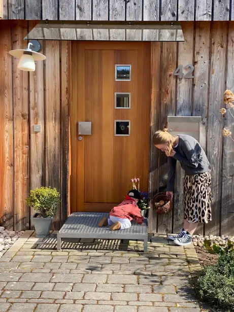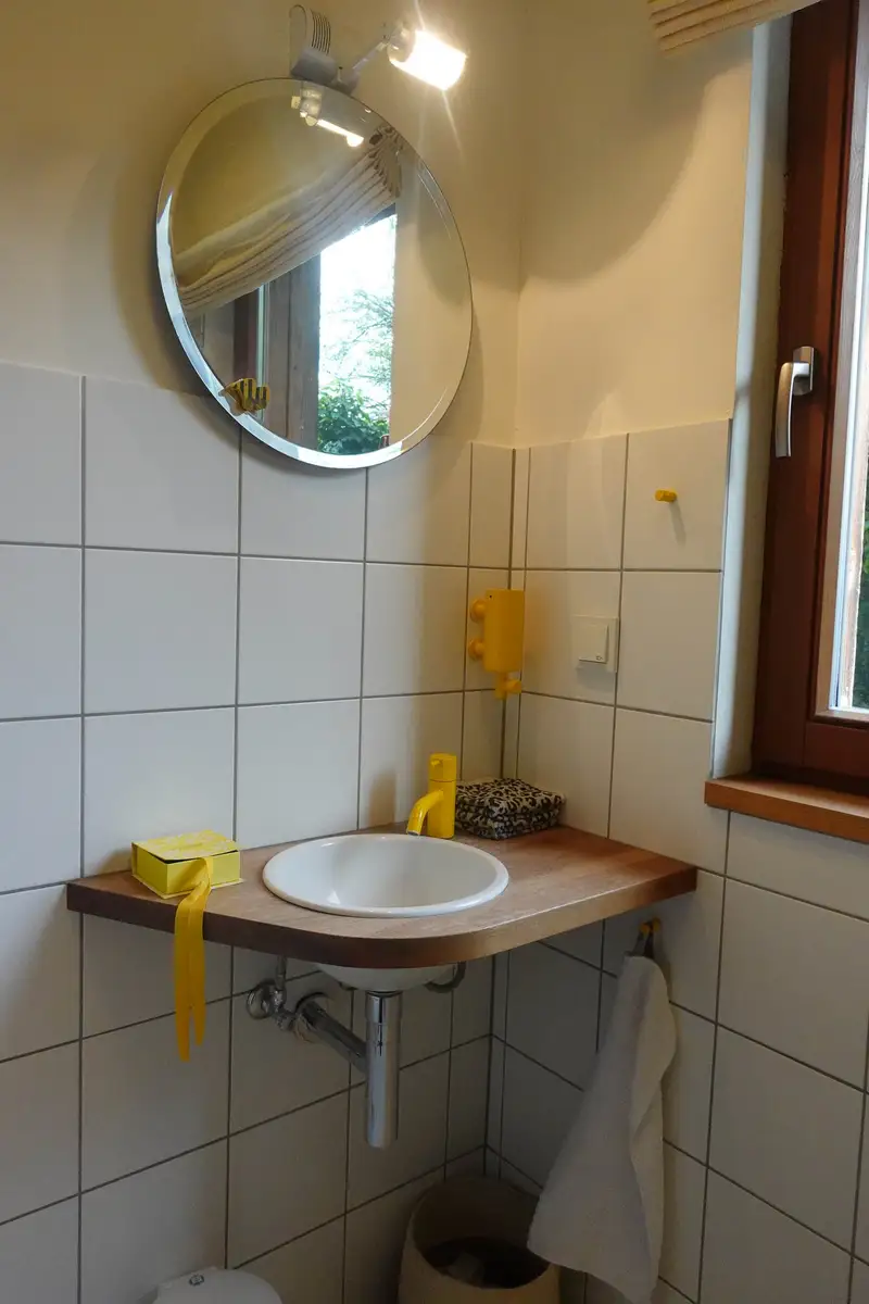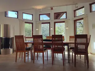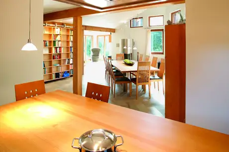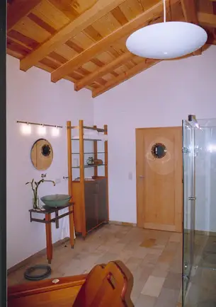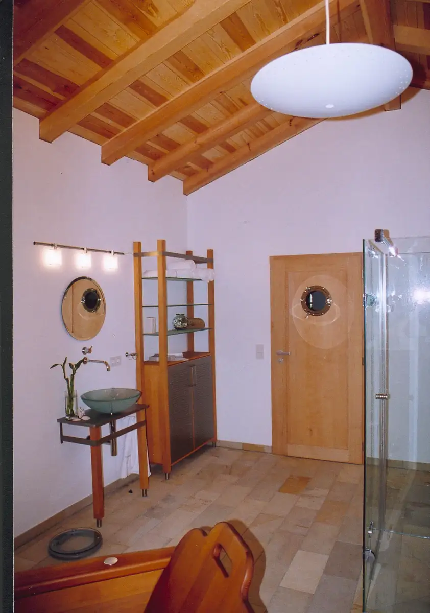 Das "Regionale Musterhaus" steht direkt neben der Möbelmacherhalle und wurde ausschließlich von Handwerkern und aus Materialien der Region gebaut. Gerne zeigen wir Ihnen auch das Badezimmer, das aus heimischer Buche mit Edelstahlwaschtisch und Lochblech in den Schrankfronten gestaltet wurde. Wir lieben die Holzbadewanne, die Solnofer Platten - sie bewähren sich auch in der Dusche - und die Armaturen von Vola.