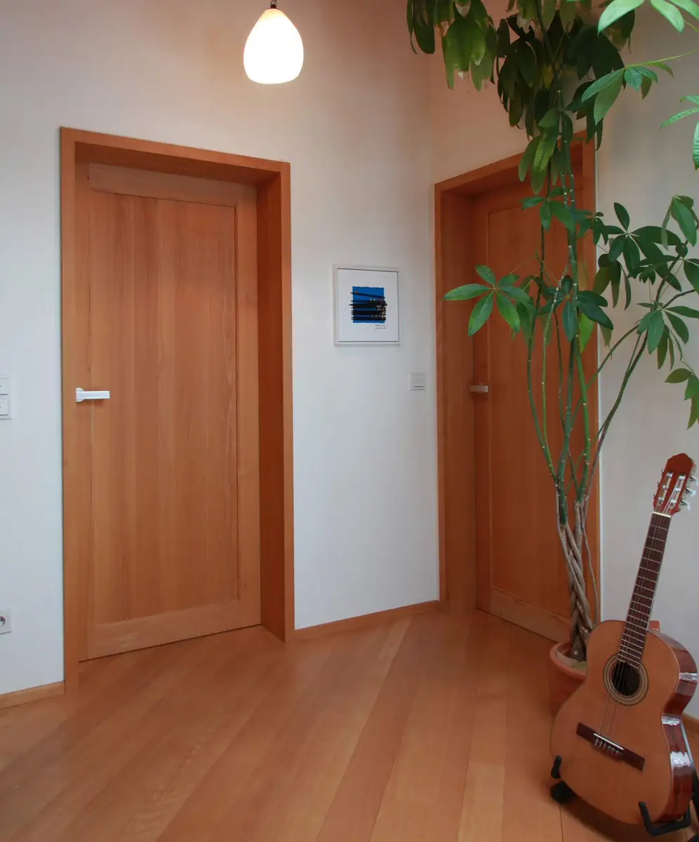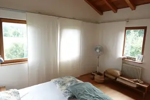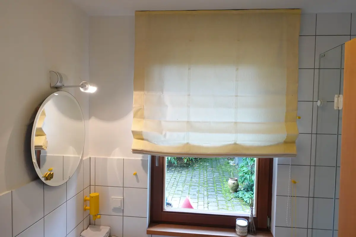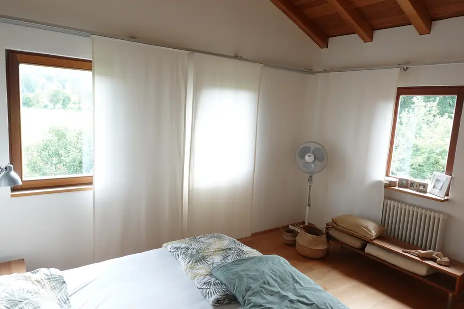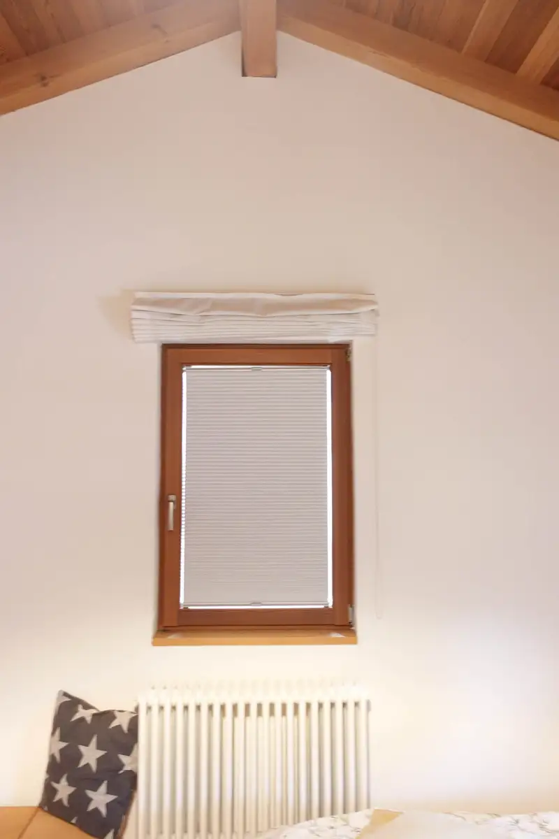 Wir haben extrem viele unterschiedliche Fenstergestaltungen eingebaut, die ein wenig beschatten, aber die Räume nur ein wenig abdunkeln können, wie zum Beispiel die Flächenvorhänge im Schlafzimmer, Holzjalousien in Küche und Bad, Vertikalanlagen im Wohnzimmer, Raffrollos im Gästebad und dem Hauswirtschaftsraum. Als das Enkelkind dann aufgrund anderer Gewohnheit in seinem Zimmer in Paris bei uns regelmäßig zu früh aufwachte, montierten wir verdunkelnde Plissees, die den Tag wirklich stockdunkel machen.