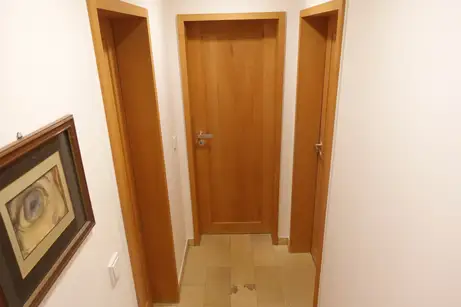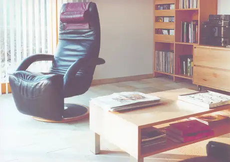 Das Wohnzimmer ist mit 440 mal 380 cm der kleinste der drei mit Küche und Essplatz verbundenen Räume. Oberhalb und seitlich des Rollis für die Hifianlage nimmt ein sehr tiefes Regal die Schübe für die CDs, die Schallplatten und vor allem alle Kunstbücher auf, die nicht in die Bibliothek passen, weil deren Maße jenseits aller Buchnormen sind. Ein Sofa, ein Sessel (nein zwei, weil ich meinen durch den neuen meiner Frau nicht ersatzlos streichen lassen wollte) ein Couchtisch reichen, einen Fernseher wollen wir hier nicht, weil er die Ruhe beim Kochen (abgesehen von der Musik) stören würde.
