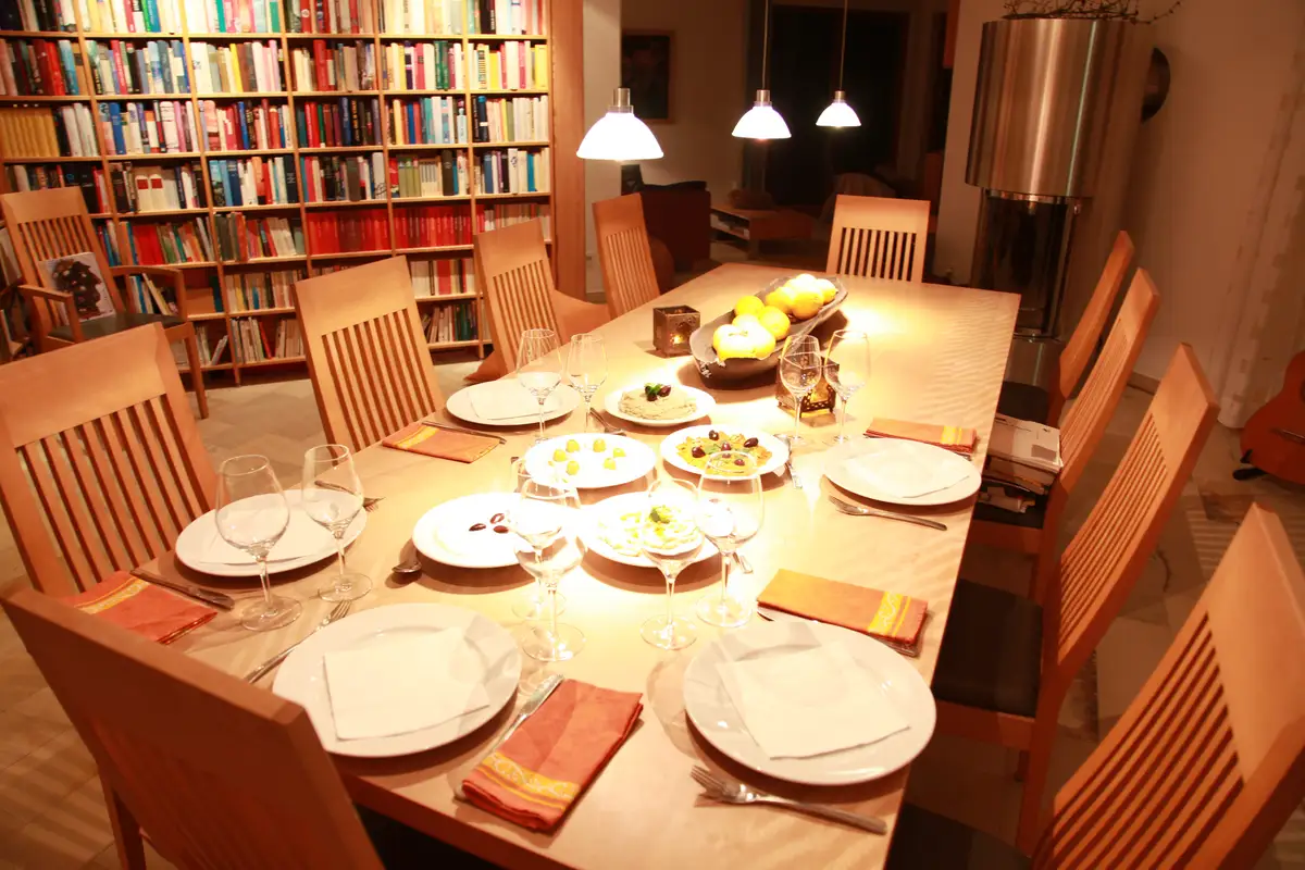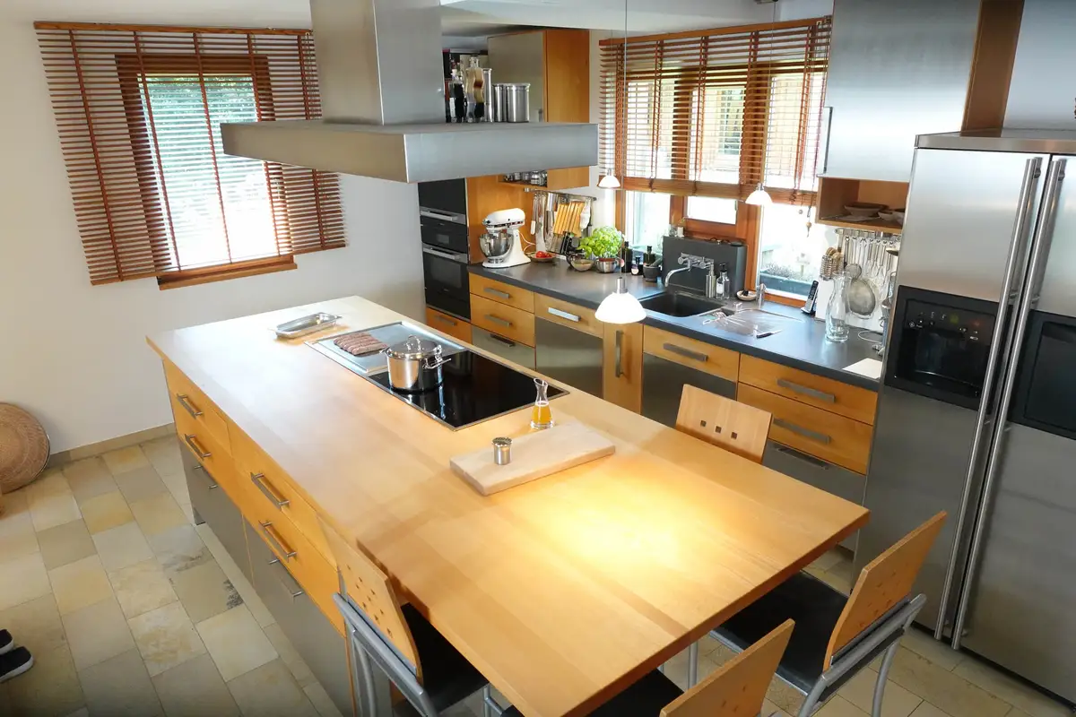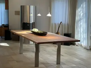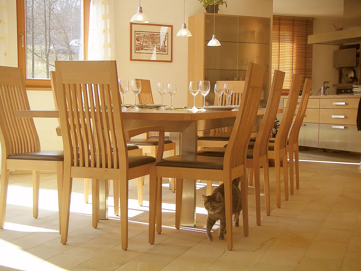 Im Esstisch sind einige Bretter mit Wimmerwuchs integriert, so heißt das bis heut noch nicht vollständig erklärbare Phänomen, dass Maserungen manchmal einen rhythmischen Verlauf nimmt. Getragen wird der von einem Edelstahlgestell, das von der Kochinsel inspiriert wurde. Er wurde 2024 mal wieder richtig nachgeölt, seitdem sind keine Gebrauchsspuren darauf zu erkennen. Der Tisch ist 270 mal 109 cm groß, daran stehen 10 Stühle, es passen aber auch 14 hin.