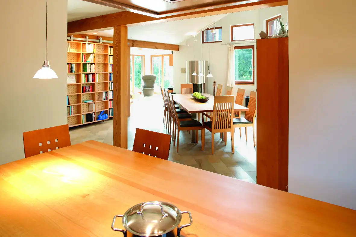 Die Kompletteinrichtung ist ausgehend von der Küche in Buche und Edelstahl gestaltet, das große Profil (10 × 40 mm), das die Kücheninsel trägt, ist das gleiche wie beim Tisch, und auch als Fuß unter dem Barschrank und sogar dem Couchtisch im Einsatz.