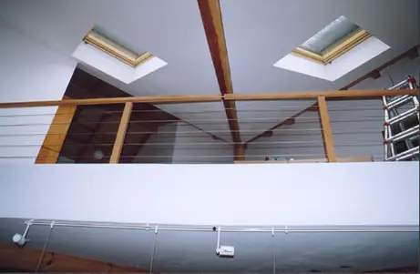 Wir machen nur selten Treppen, aber wenn, dann mit voller Freude. Unsere dreht nach 5 Stufen und dem Absatz 90 Grad nach rechts und die restlichen 10 führen in die Galerie. Sie hat eine wunderbare Beleuchtung auf Kniehöhe, das Geländer ist das Bücherregal, das dank der Löcher in der Rückwand eigentlich leicht durchsichtig wäre, die durch die vielen Bücher leider verdeckt sind. Die Treppe führte uns 22 Jahre unfallfrei nach oben und vermutlich gleich oft nach unten und wir würden sie auch wieder als Wangentreppe aus reinem Massivholz konstruieren.