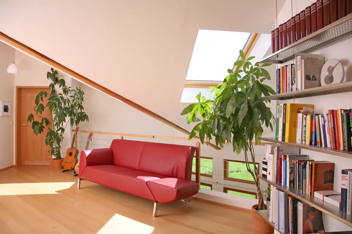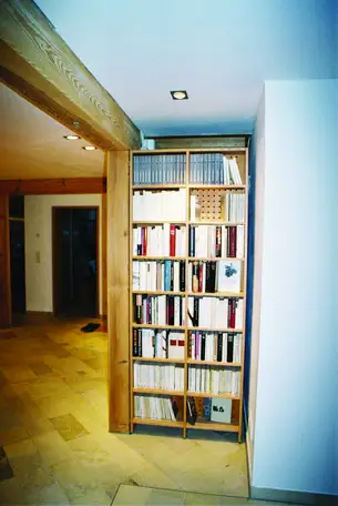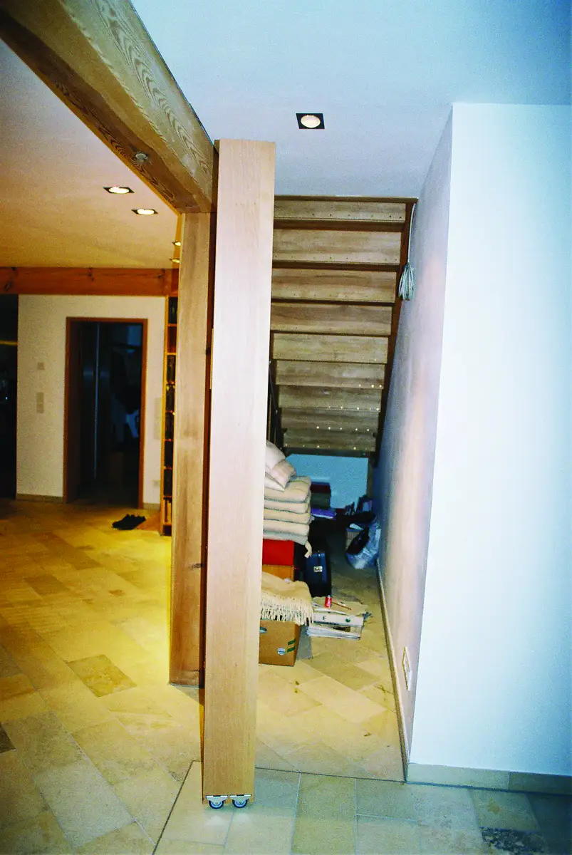 Den Stauraum unter der Treppe kann man nutzen, weil sich das Bücherregal mithilfe von Scharnieren und einer Rolle ganz leicht öffnen lässt. Über diesen Stauraum freuen sich vor allem Baufrauen und -herrn, die keinen Keller haben.