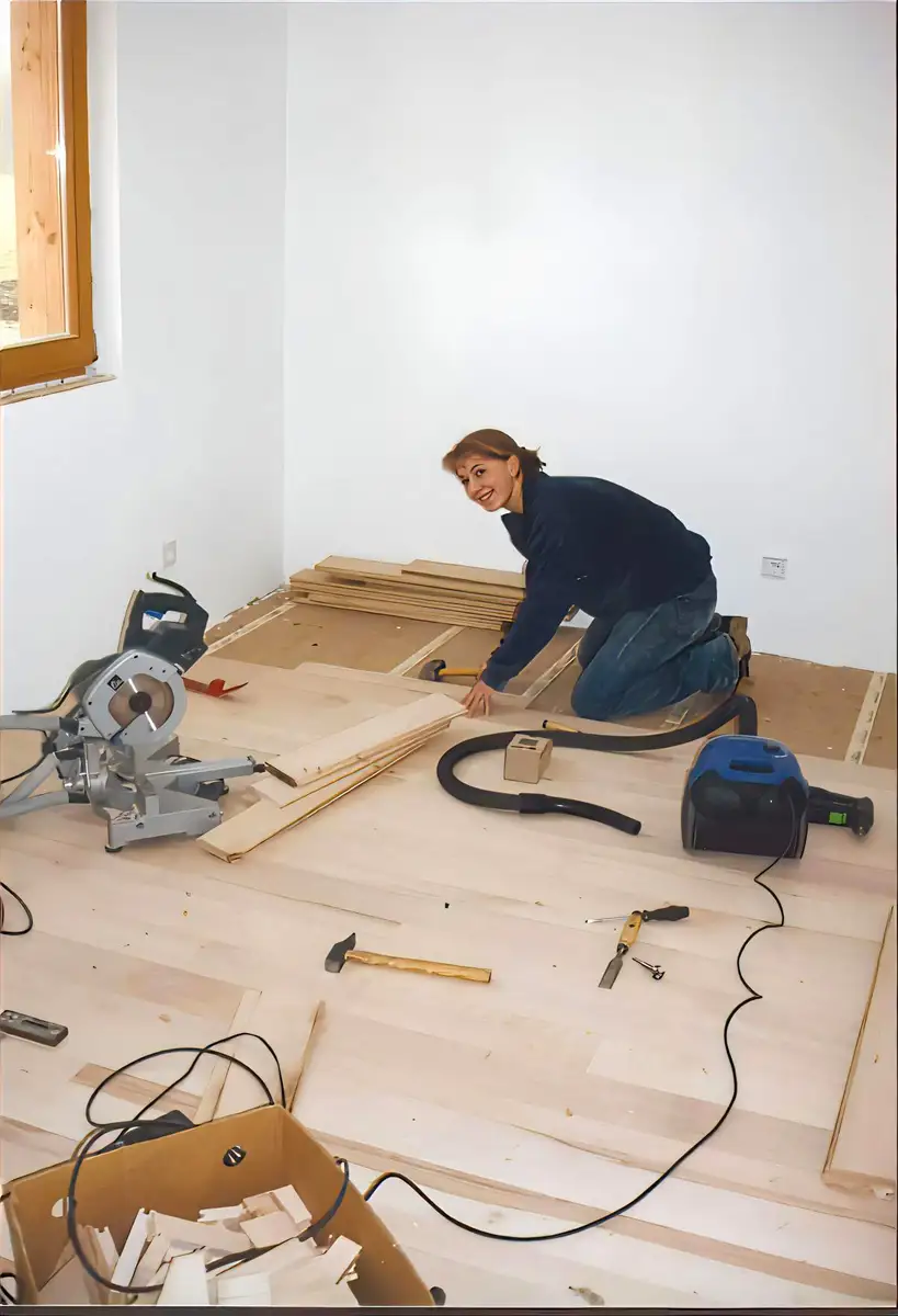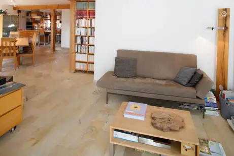 Es gibt im regionalen Musterhaus die Solnhofer Platte in bruchrauh im Erdgeschoß und im großen Bad, die beiden anderen Bäder sind weiß gefliest. Der Rest ist der von uns eingeschnittene und gefräste Dielenboden aus dem Holz der Hersbrucker Alb, verlegt vom Möbelmacherteam, hier Simone.