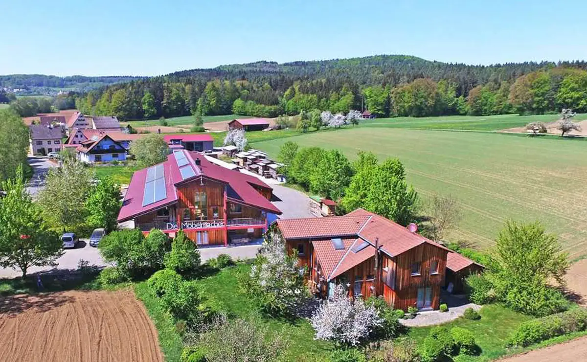 Unterkrumbach Sunrise ist kein neues Mixgetränk, sondern das Erlebnis von guter Architektur mit Kiefer (als Konsturktionsholz) und Lärche (an der Decke), Nussbaummöbeln und ohne Wecker.