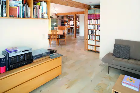 Erdgeschoss mit Küche, Essplatz, Bücherwand und Wohnzimmer