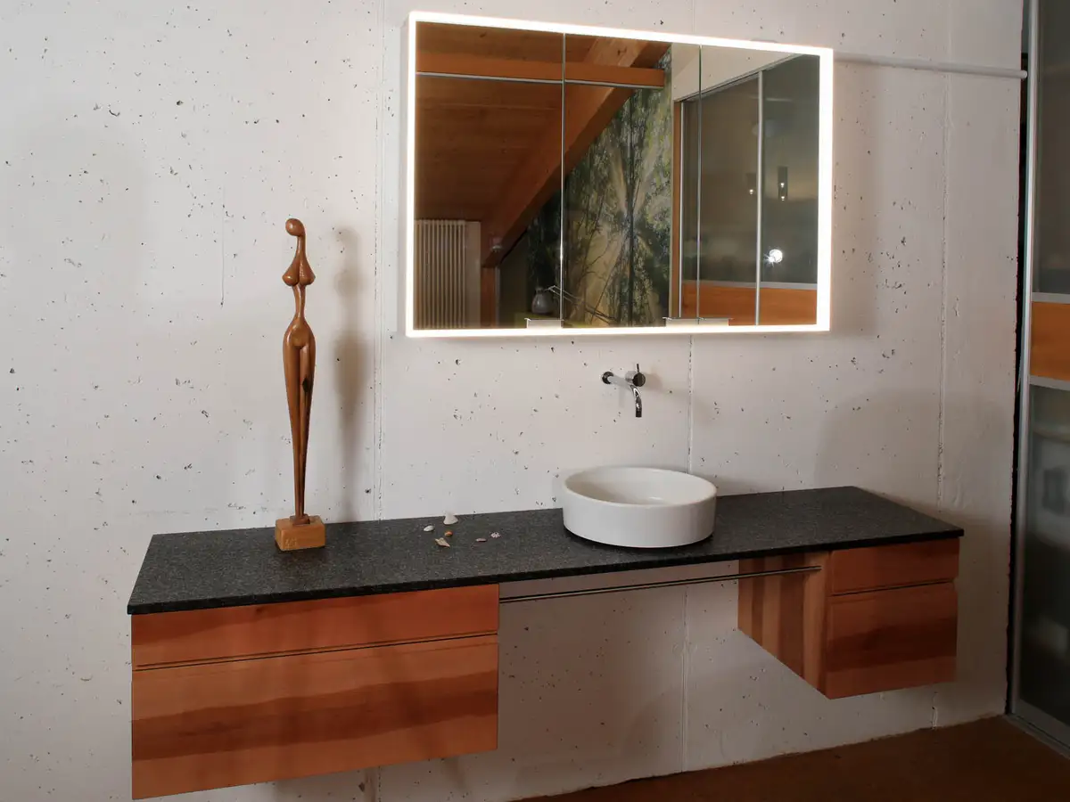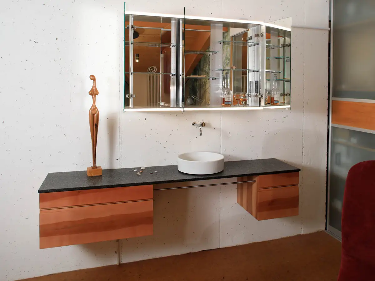 Das Badezimmer in unserem Loft hat einen Waschtisch aus massivem Speierling, der seltene Baum ist mit der Elsbeere und der Vogelbeere verwandt und ebenfalls sehr hart und besonders elegant gemasert. Darauf liegt eine Granitplatte, die wiederum das Becken aus Keramik von Systemceram trägt. Darüber ist unsere Lieblingswandarmatur von Vola und darüber ein raffinierter Spiegelschrank aus Metall und Glas von Zierath. (Den haben wir ins Programm genommen, weil unsere Kunden manchmal auch nur einen Spiegelschrank suchen, der dann nicht zum Holz passen muss, ansonsten machen wir Ihren Spiegelschrank natürlich auch gerne aus Ihrem Wunschholz.)