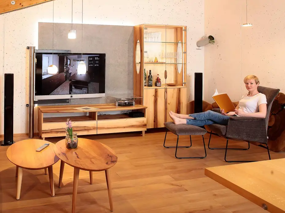 Wohnzimmer mit TV- und Hifianlage in massiver Elsbeere