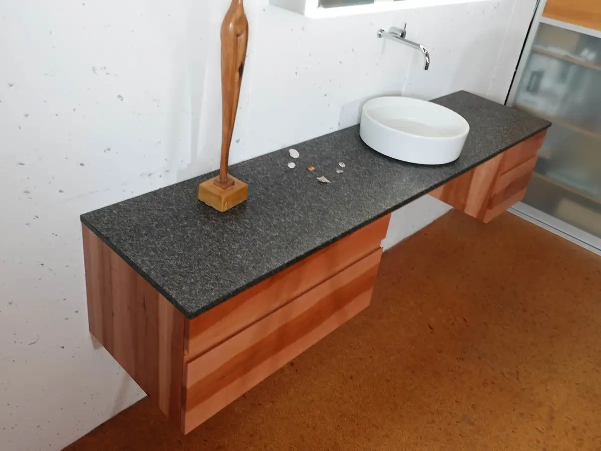Der Waschtisch ist aus dem Holz des Sperlings mit Granitplatte und Keramikbecken