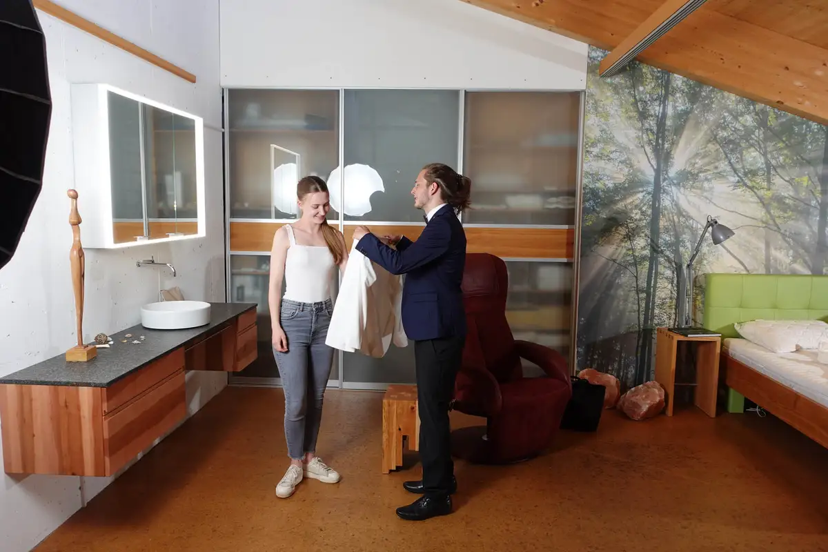 Leben im Loft: Emma Heb und Peter Proff präsentieren die Massivholzmöbel im Loft unserer Ausstellung