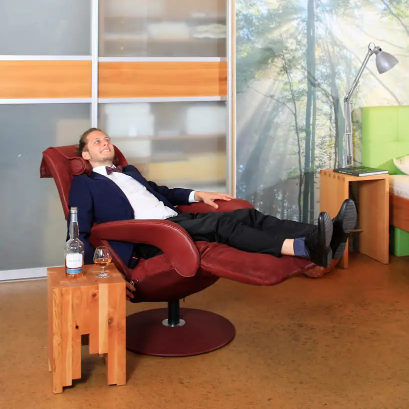Der Hocker neben dem Sessel ist aus Kirschbaum kreativ verleimt und aus unserer Ausstellung direkt zu haben.