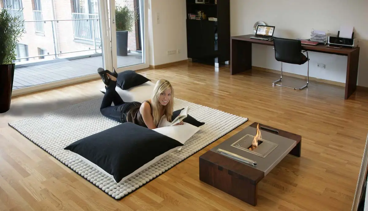 Ein kuscheliger Teppich mit passenden fast arabischen Kissen von Kinnasand, der Bioäthanolofen Ecosmart eingebaut in die Massivholzmöbel der Möbelmacher