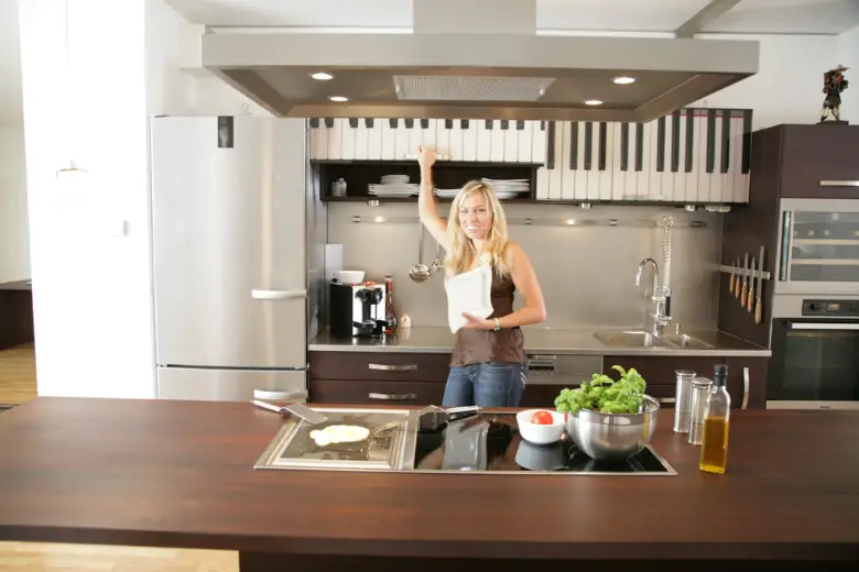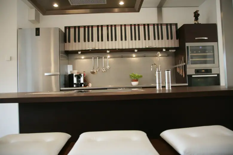 Hier wurde Laras musikalischer Ader Genüge getan: die Oberschranktüren bestehen aus mit einer Klaviertastatur digital bedrucktem Glas. Die nächste Generation hat sicher ein paar Sensoren des Synthesizers integriert, aber Lara muss noch selber syngen