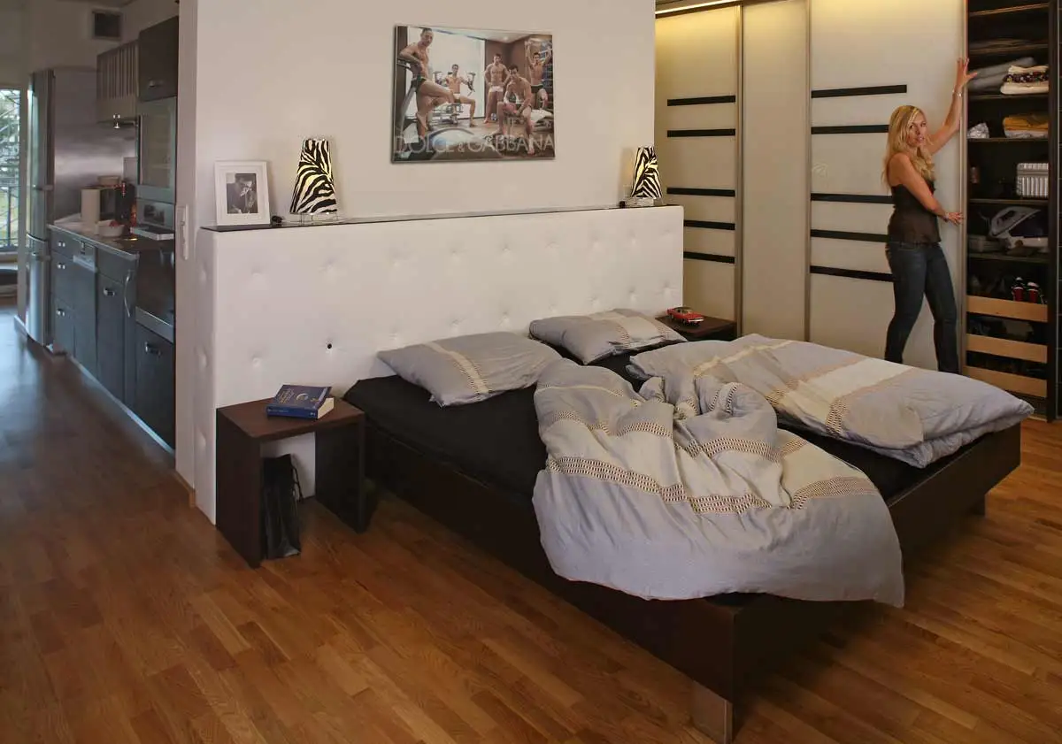 Laras Loft in Düsseldorf. Ein großer Raum mit in der Mitte integriertem Bad, ansonsten alles offen (wie die Richter Skala). Komplett eingerichtet von den Möbelmachern