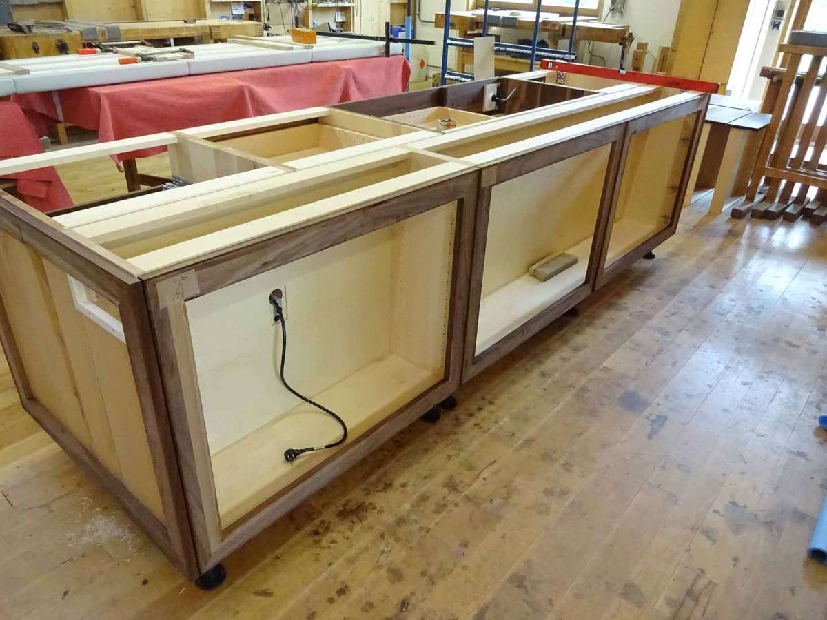 Neben den Bedienknebeln des Tepan Yaki ist noch eine (amerikanische) Steckdose, der Nussbaumkorpus unter den Kochfeldern hat Topfauszüge und eine Schublade für Kochbesteck