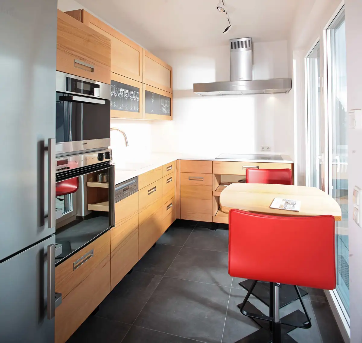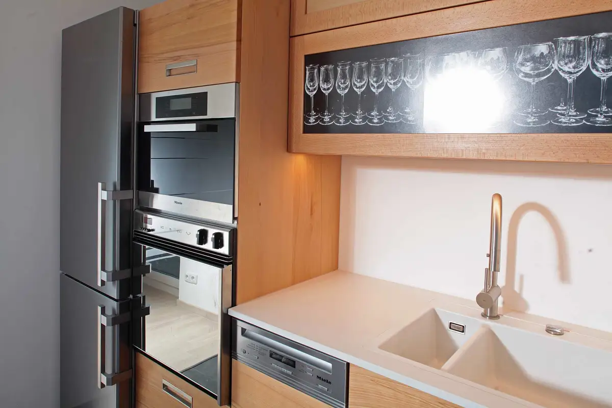Eine L-Küche in Buche mit Kühlschrank und Backofenhochschrank, der auch den Dampfgarer aufnimmt. Die Oberschranktüren sind eigentlich Bilderrahmen mit entspiegeltem Glas, die die Fotos des engagierten Leicafotografen aufnehmen. Die Arbeitsplatte ist aus gesinterter Keramik, das Becken aus Laborkeramik von Systemceram. Induktionskochfeld, Dunstabzug, Spülmaschine und Dampfgarer von Miele, Kühlschrank von Liebherr, Buche aus der Hersbrucker Alb.