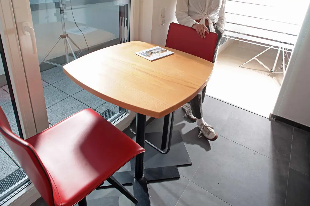 Das Gestell des Tisches auf Arbeitshöhe wurde so gestaltet, dass es die Bodenplatten der Tresenhocker platzsparend aufnehmen kann