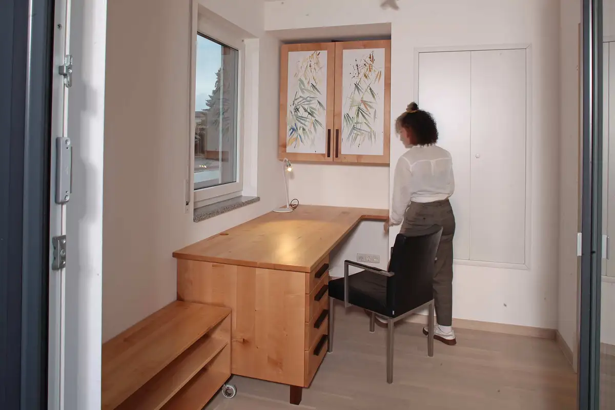 Das Arbeitszimmer ist mehr für künstlerische Arbeiten, denn Computertechnik geplant, obwohl natürlich beides geht. Die Inhaberin ist anerkannte Künstlerin und hat die Oberschranktüren selbst gestaltet. Auch in diesem Raum könnte man noch einen Schlafplatz unterbringen.