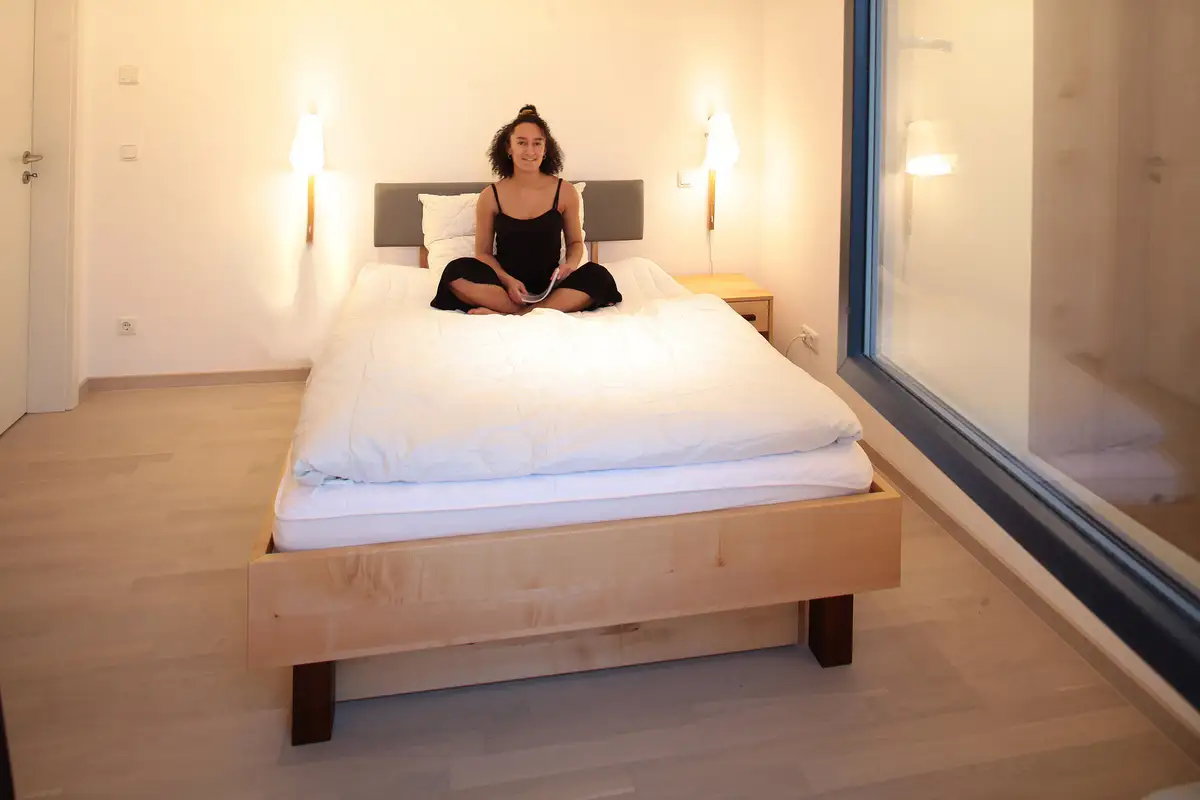 Massivholz-Schlafzimmer in Ahorn mit Beleuchtung und Pro Natura Bettsystem